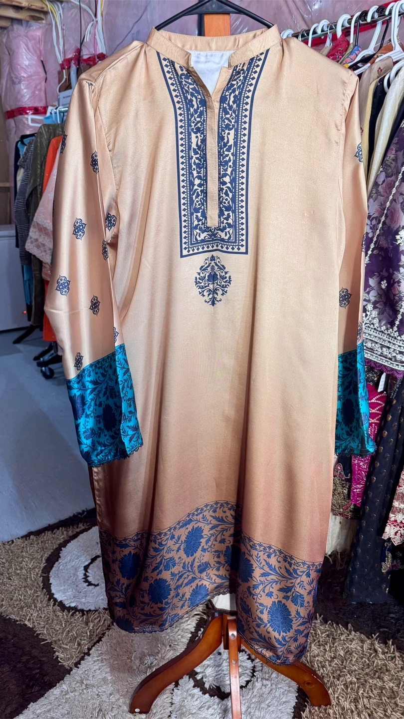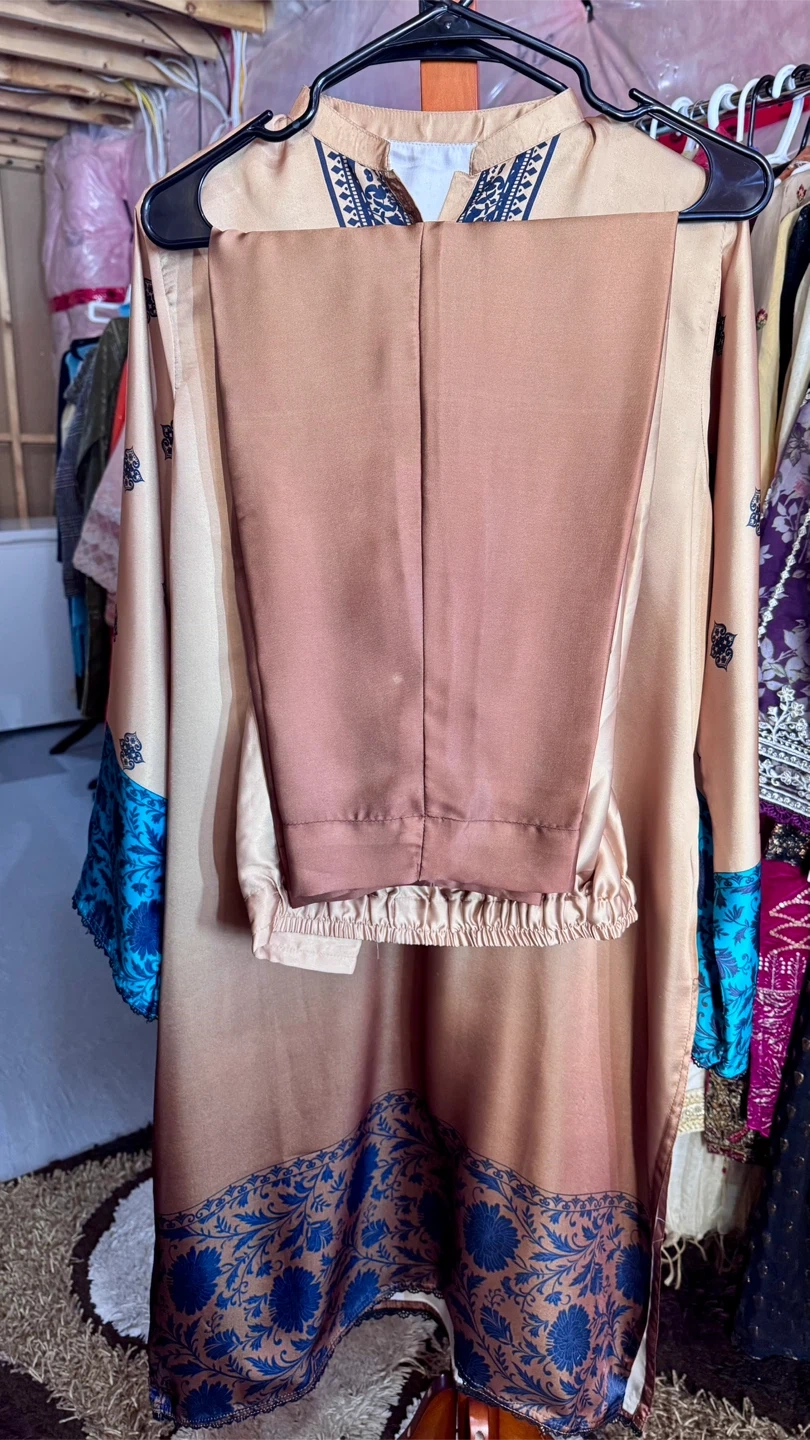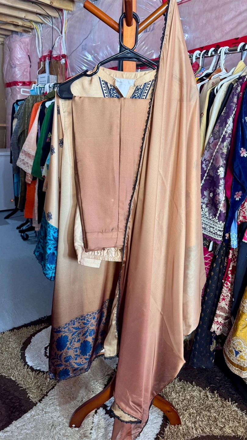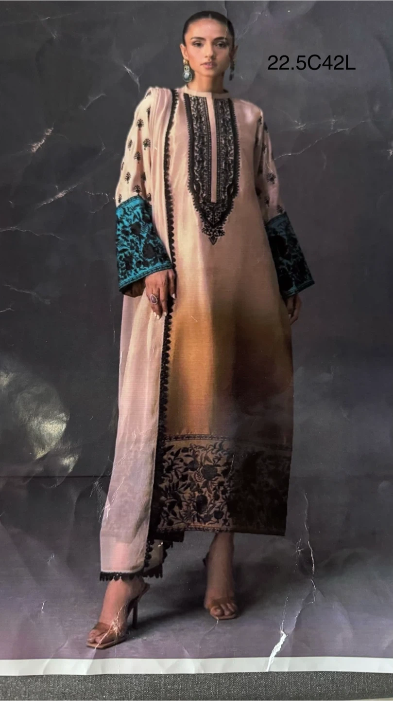 Selling a lovely ladies' salwar kameez suit in size L. The suit features a beautiful design with blue floral accents and a gradient effect on the fabric. It includes a top, pants, and a coordinating shawl. Perfect for a special occasion or everyday wear!