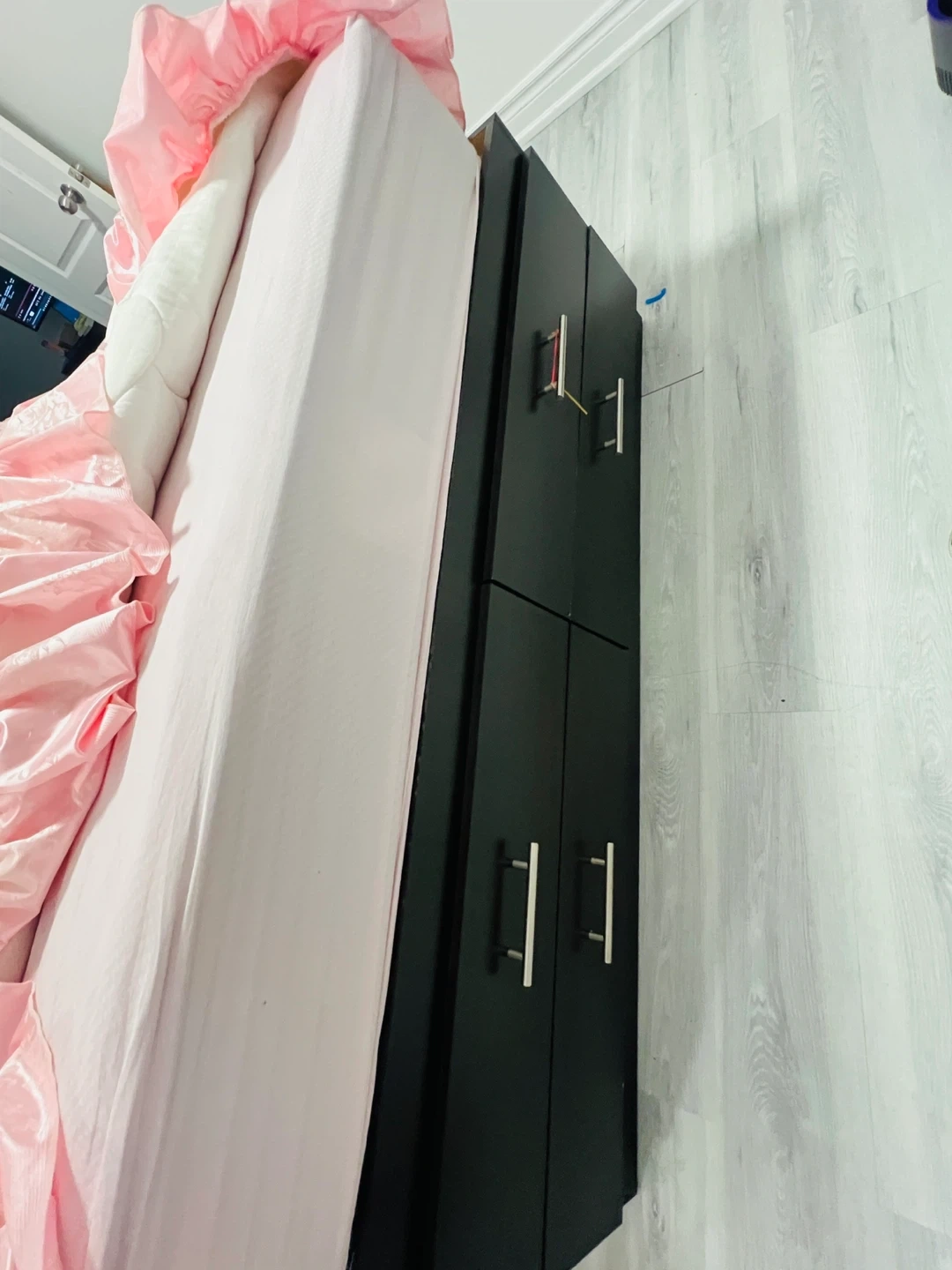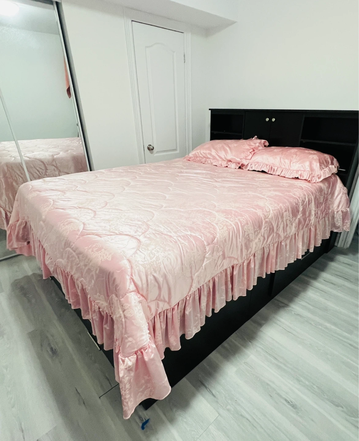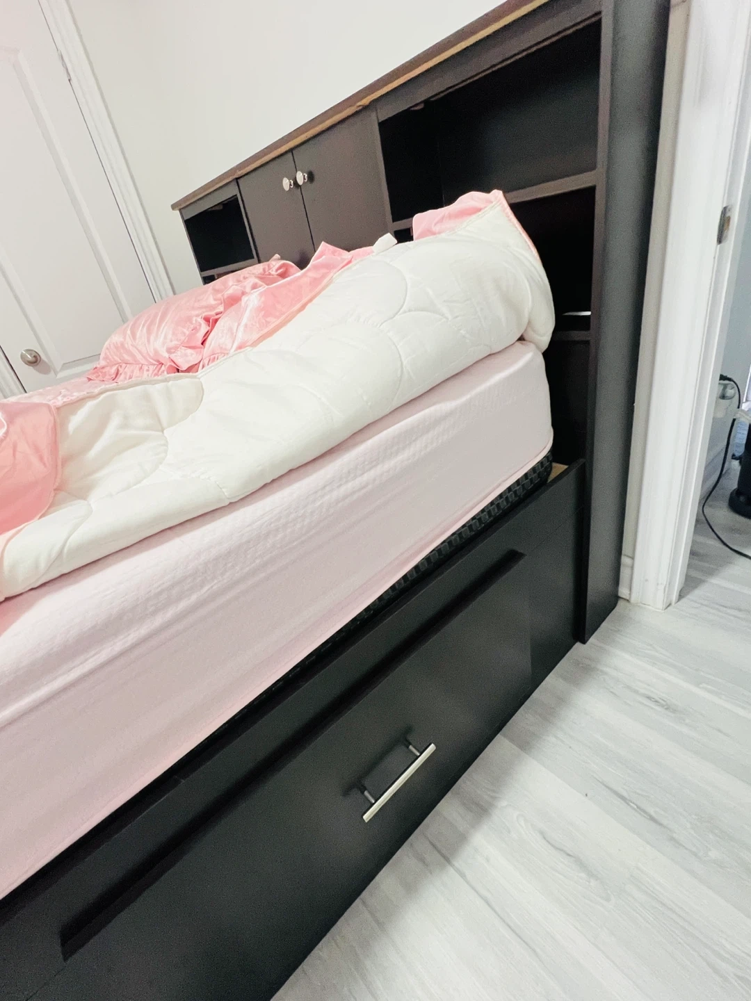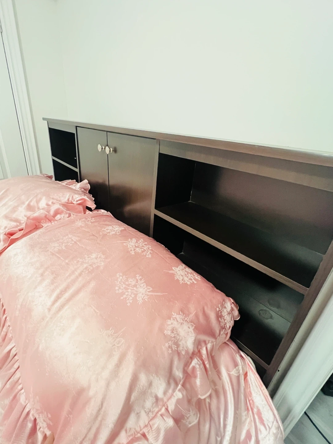 Selling a queen size bed with a dark brown headboard. The headboard has built-in shelves and cabinets for extra storage. Includes a pink comforter set with matching pillow covers. It's in great condition and ready for a new home!