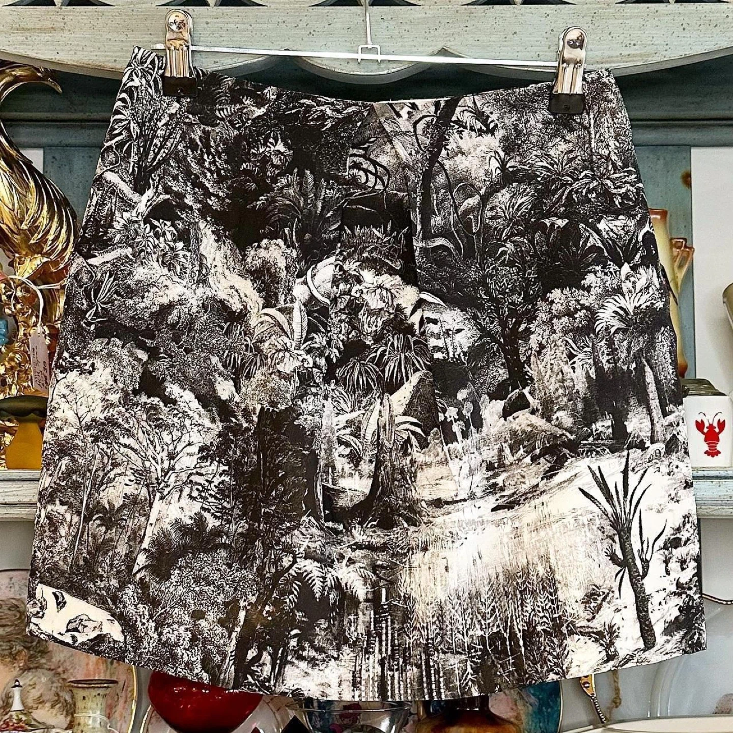 Amazing black and white silk mini skirt featuring an all-over intricate art print of nature / forest scenery.