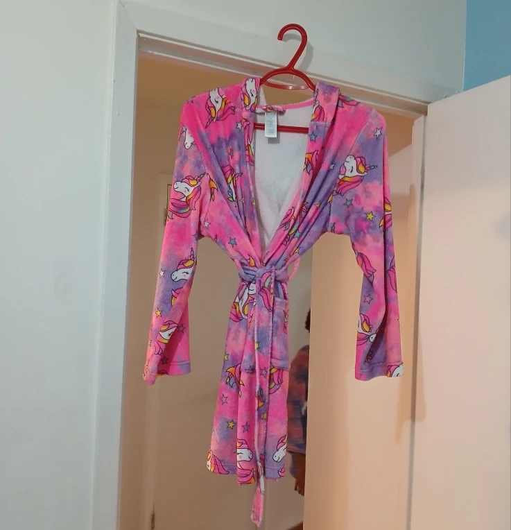 This is a super cute pink and purple unicorn print robe! It's in great condition and would be perfect for lounging around the house