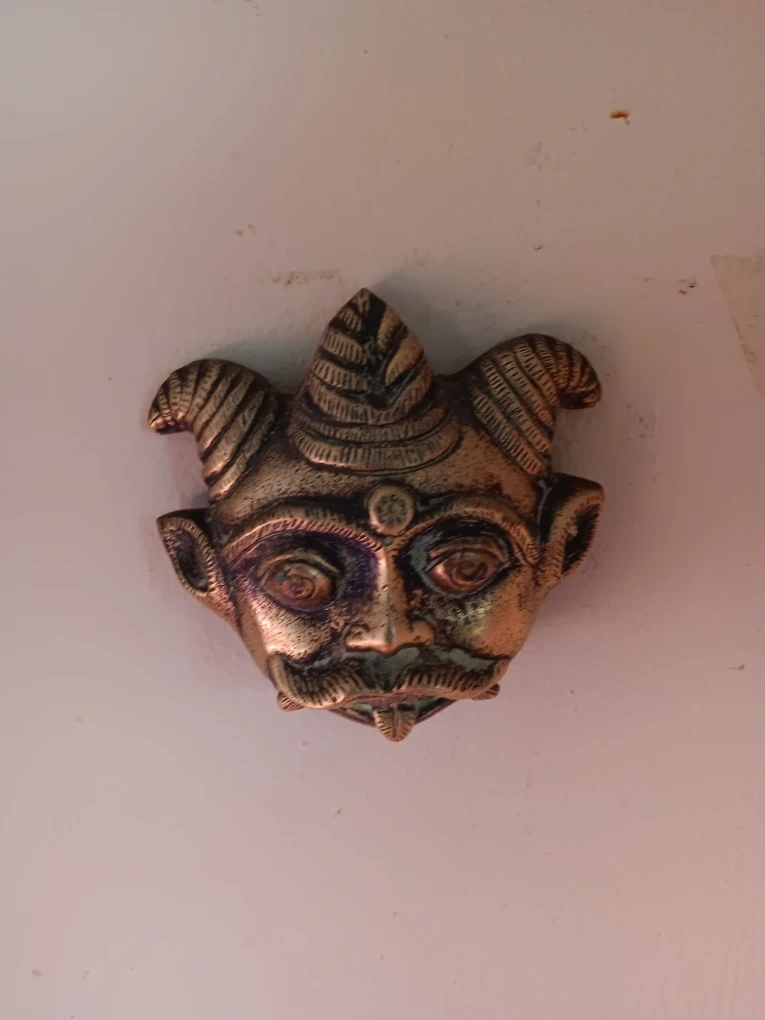 Unique vintage brass wall hanging featuring a devil face design. It has a cool, antique look and would be a great addition to any collection or decor