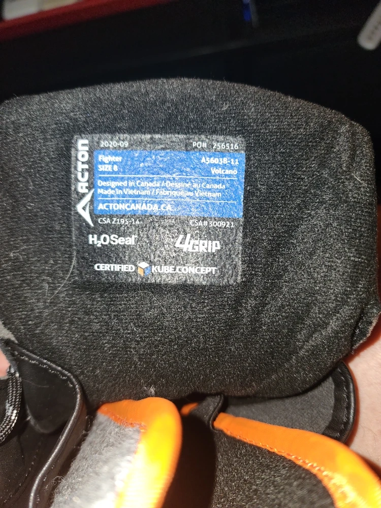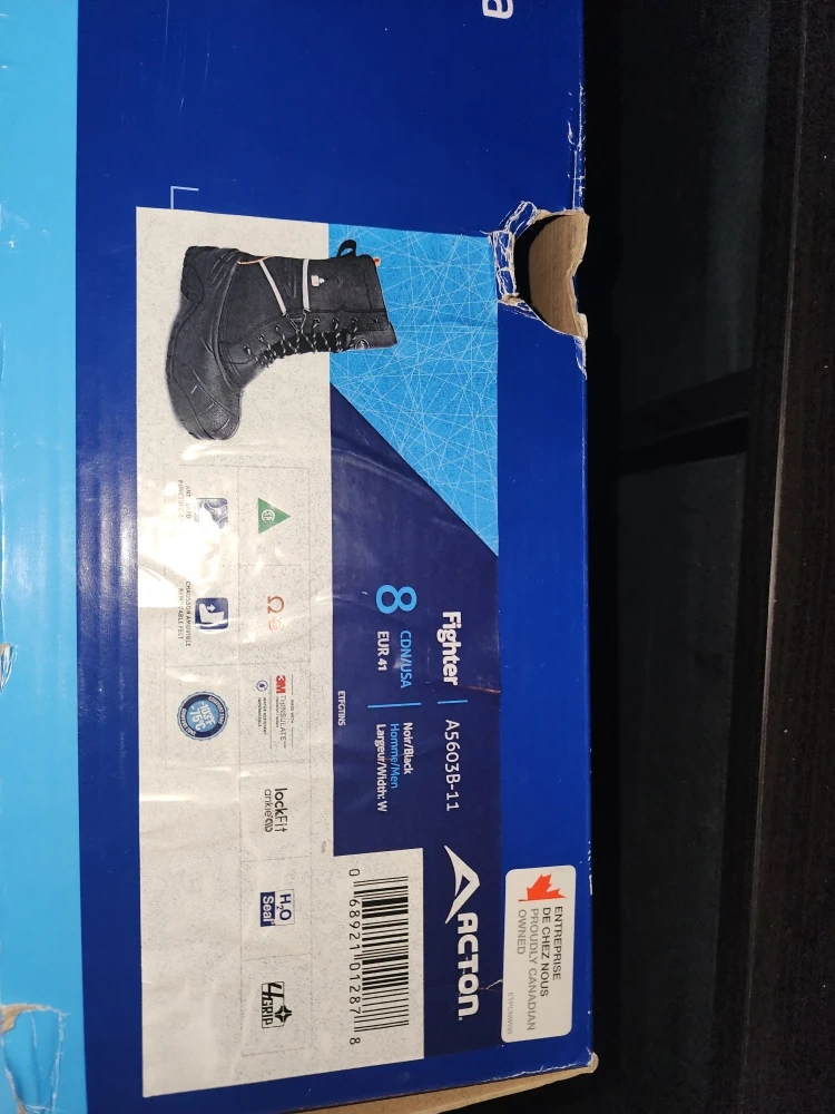 Selling a pair of Acton Fighter A5603B-11 work boots in black, size 8. These boots are designed in Canada and made in Vietnam. They feature H2O Seal and 4-Grip technology. The original price was $299.99