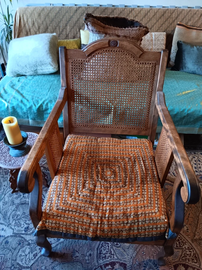 Selling a vintage armchair with a beautiful wood frame and woven wicker back. The cushion has a unique patterned fabric. It's a sturdy and stylish piece that would add character to any room!