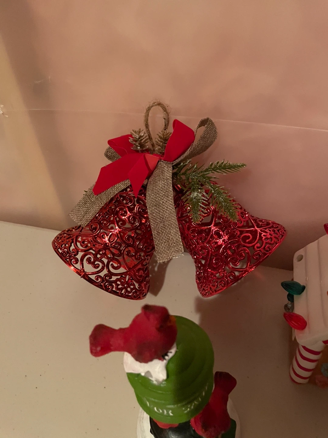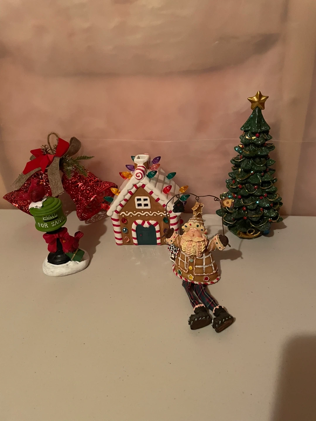 Selling a set of cute Christmas decorations! Includes a gingerbread house with lights, a Christmas tree, a set of red bells, and a 'Mail for Santa' figurine. Perfect for adding some holiday cheer to your home!