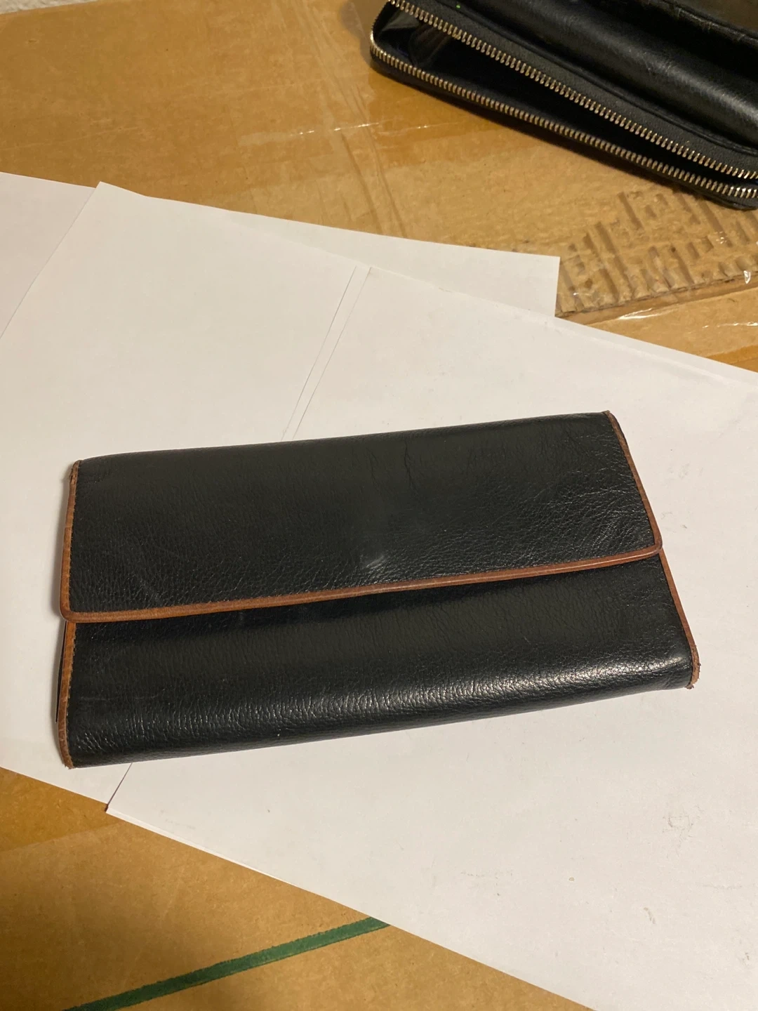 tri-fold wallet. It is black with brown trim and 2 zippered coin compartments-inside and on the back.It's in good condition and ready for a new home. (Compare price eBay $30)