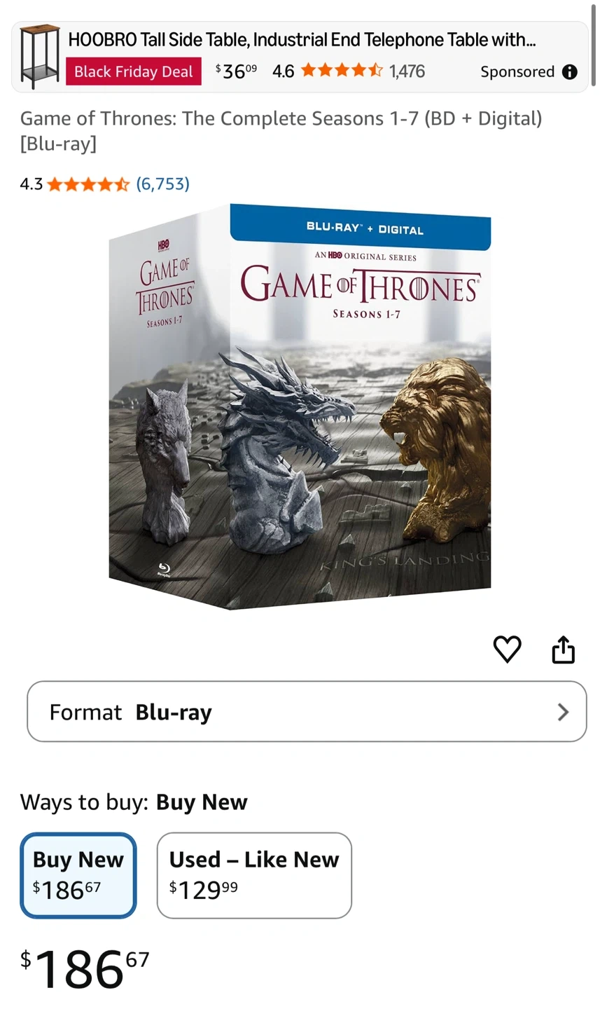 Selling a new, sealed Game of Thrones: Seasons 1-7 on Blu-Ray + Digital HD box-set! It includes over 30 hours of bonus features, including audio commentaries with the cast and crew. Get ready to dive into the Seven Kingdoms!