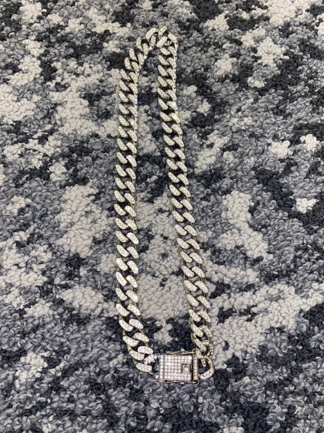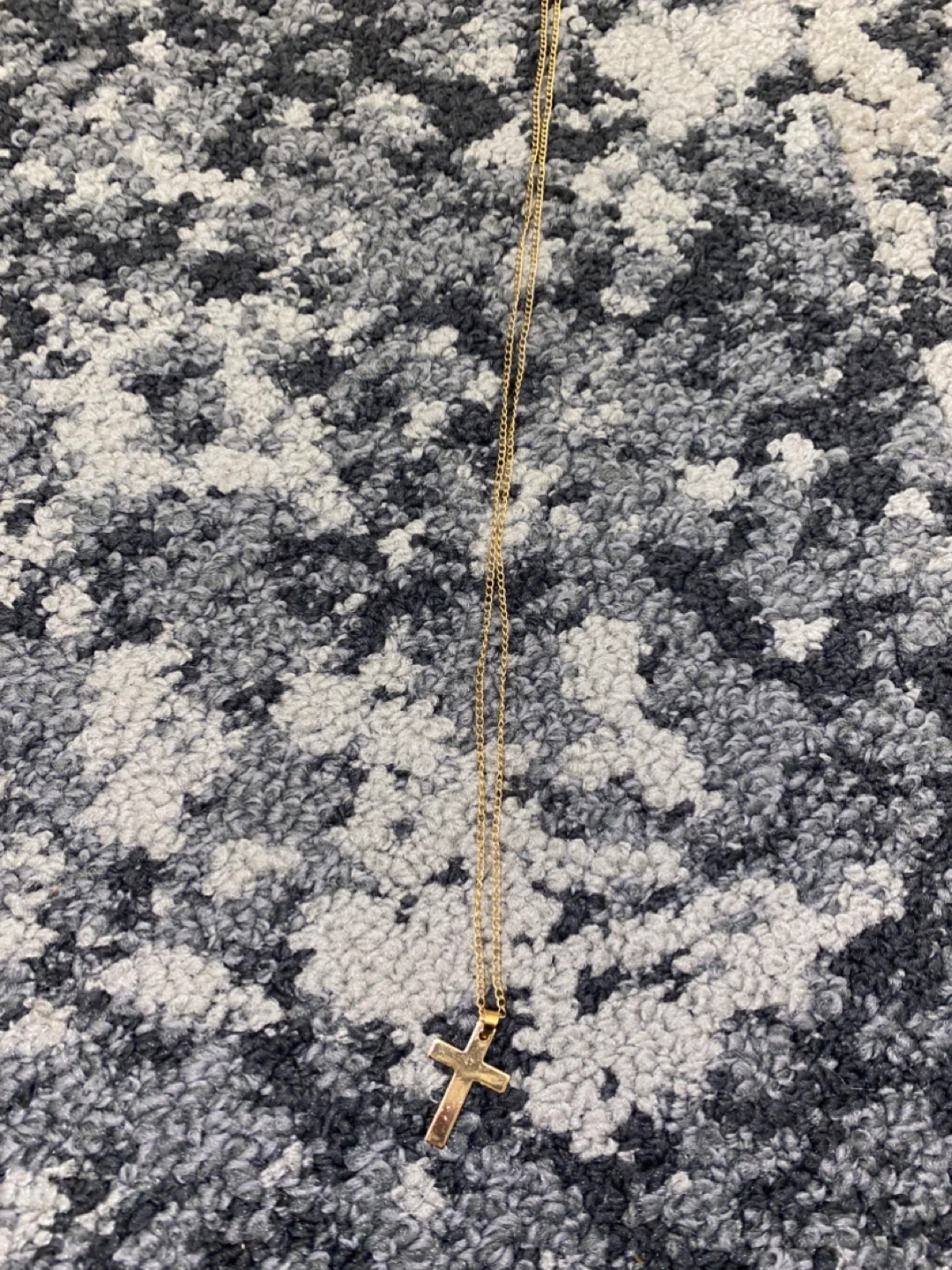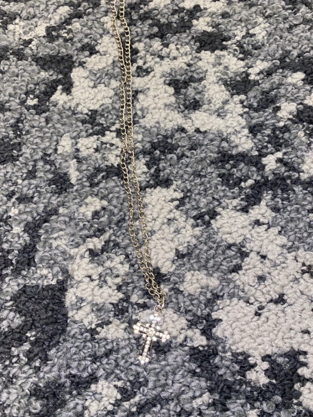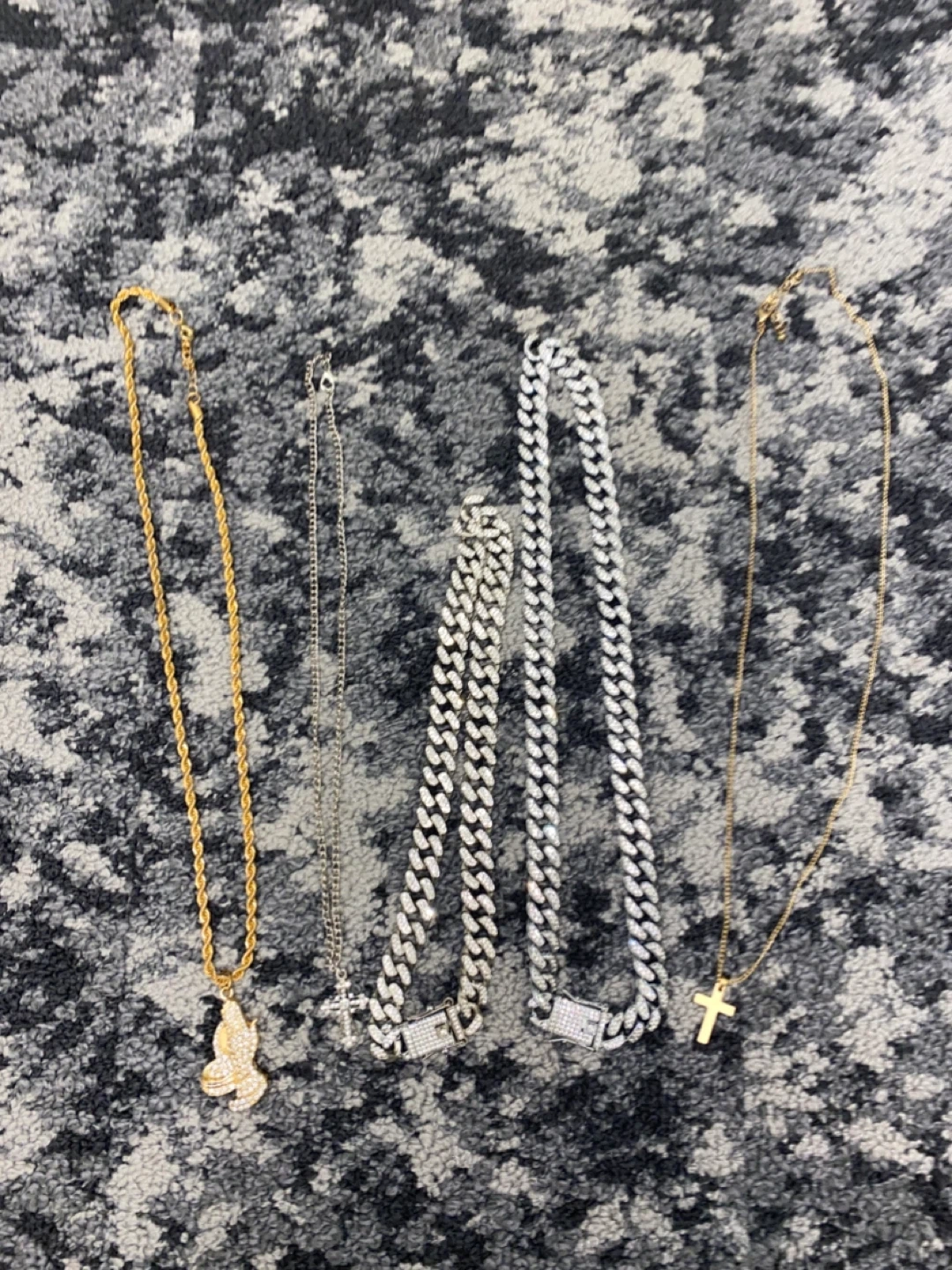 Selling a variety of necklaces! There's a gold rope chain with a praying hands pendant, a thin silver chain with a cross, two chunky silver Cuban link chains, and a delicate gold chain with a cross pendant. They're all in great condition and ready for a new home
