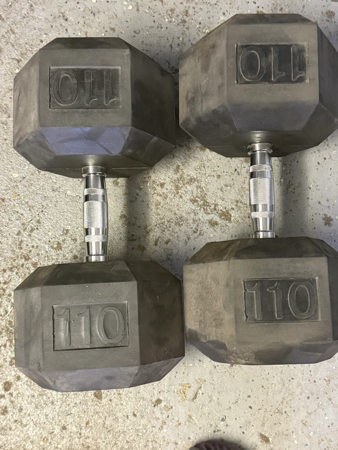 Buy & SellPair of 110 lbs DumbbellsPair of 110 lbs Dumbbells$120Selling a pair of 110 lbs dumbbells. They are in very good used condition.ConditionGoodWHERE TO MEETCheck LocationView MapSELLERNeeshMadoc100 reviews0 chats·0 favorites·16 views