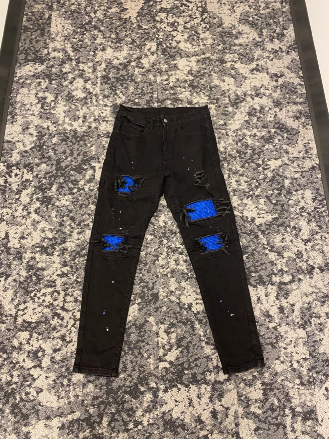 Selling a pair of black jeans with distressed rips and blue patches underneath. They have a unique, edgy look with some paint splatter details. Great for adding some character to your wardrobe!