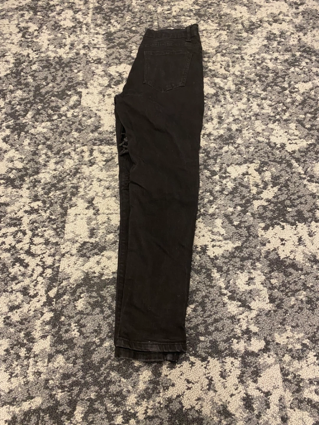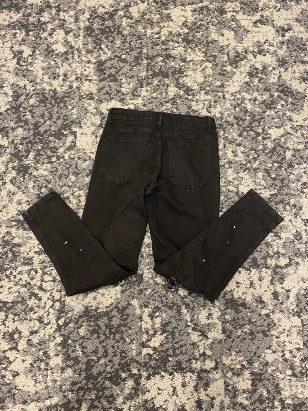 Selling a pair of black jeans with distressed rips and blue patches underneath. They have a unique, edgy look with some paint splatter details. Great for adding some character to your wardrobe!