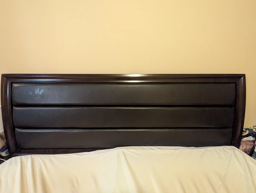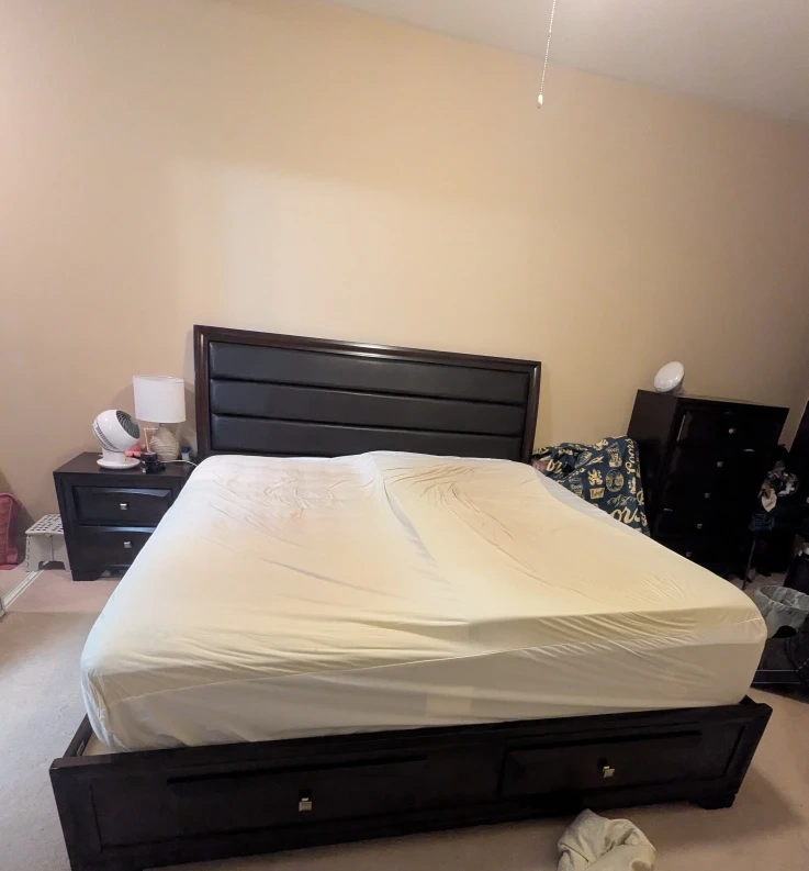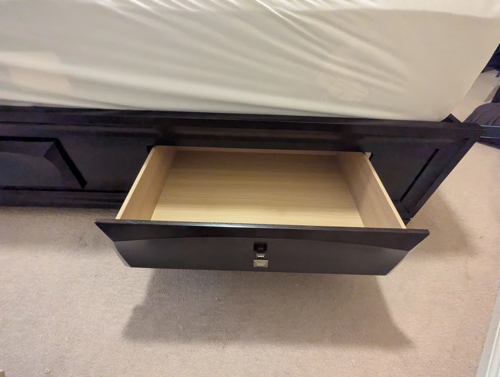 Selling a king size bed frame in a dark brown colour. It features convenient storage drawers built into the base. Perfect for adding extra storage space to your bedroom!