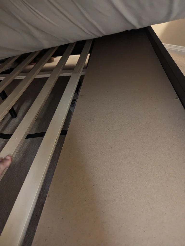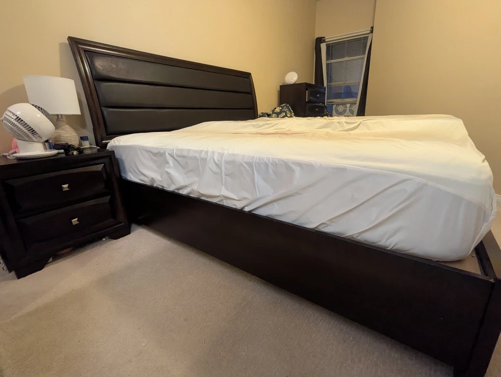 Selling a king size bed frame in a dark brown colour. It features convenient storage drawers built into the base. Perfect for adding extra storage space to your bedroom!