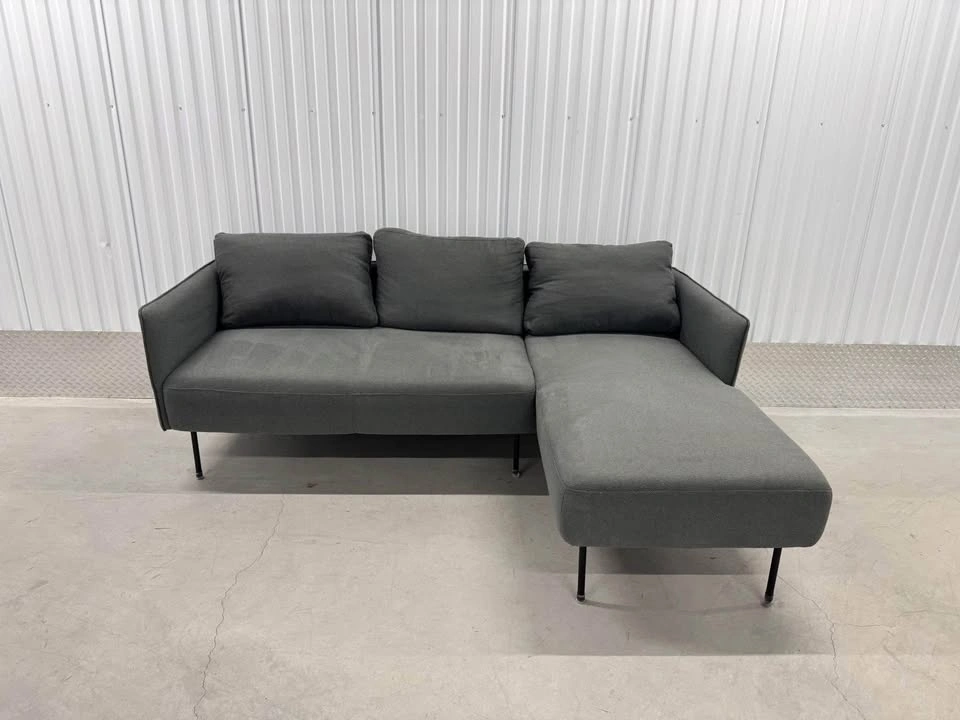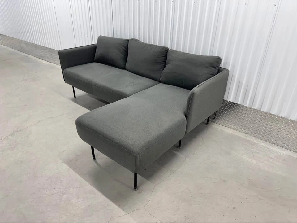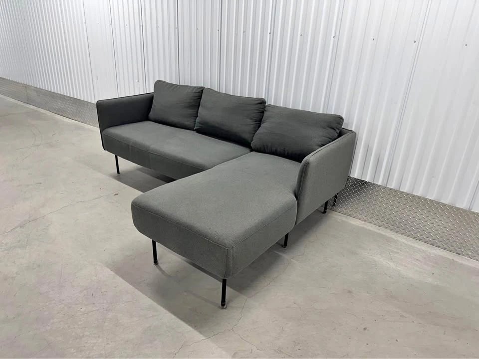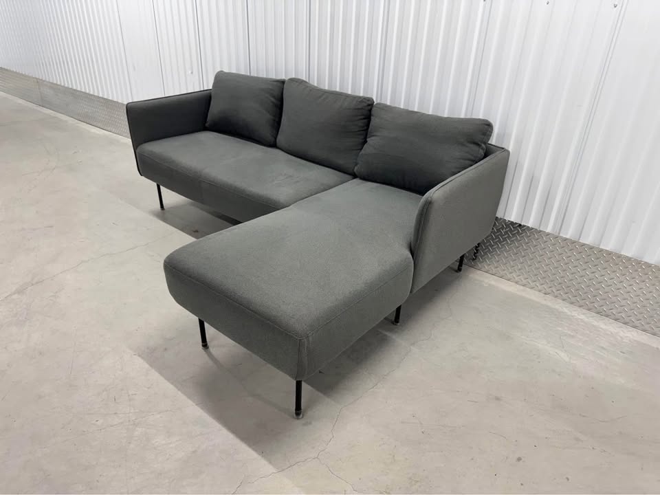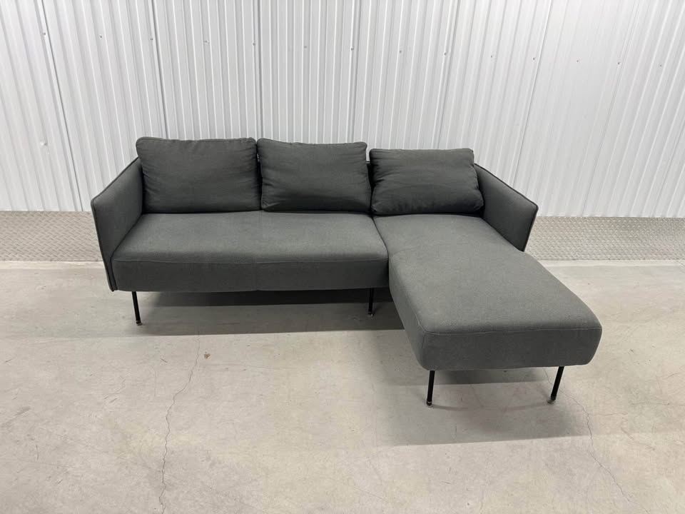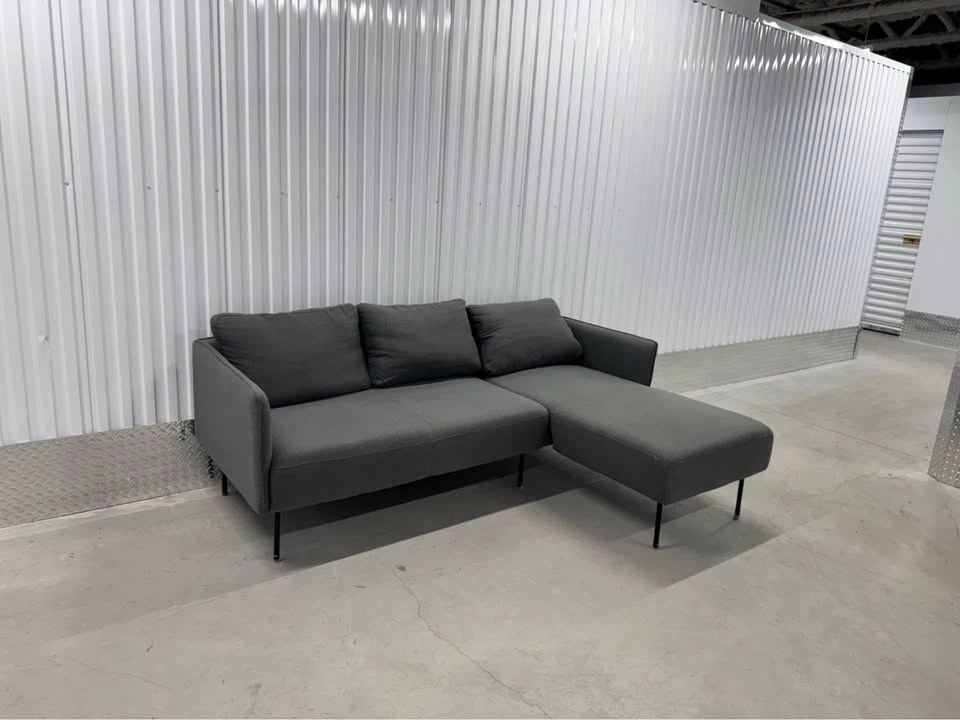 Modern dark grey fabric sectional sofa. Includes chaise lounge. Sleek black legs. Excellent condition. Measurements provided in images.