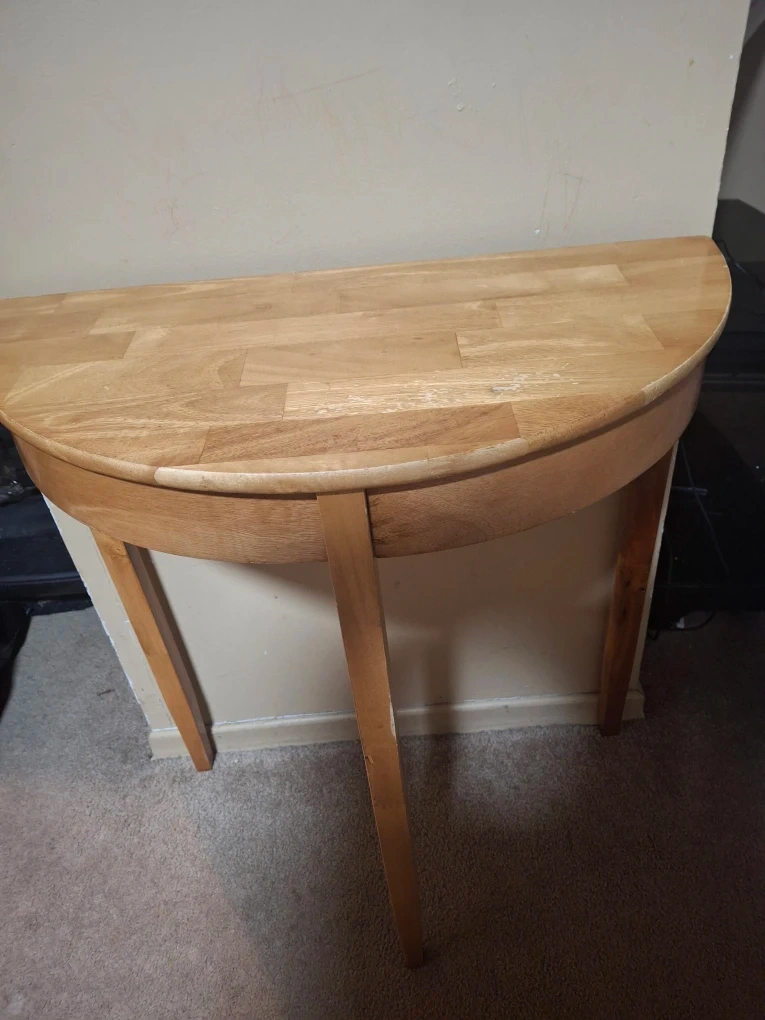 Selling a lovely half-moon shaped console table! It's perfect for small spaces or entryways. The table is made of light-colored wood and has a classic, simple design. It would look great in any home!