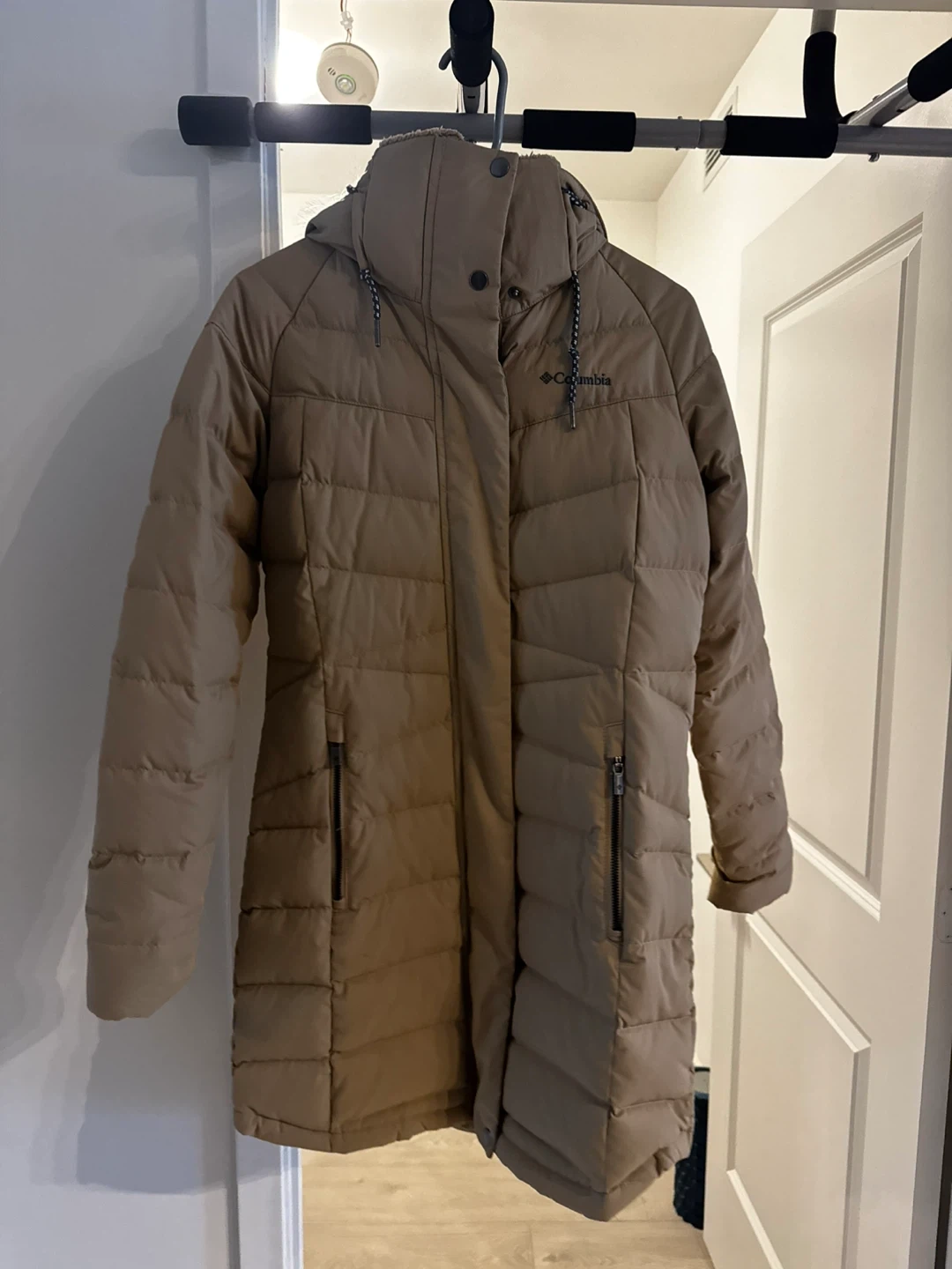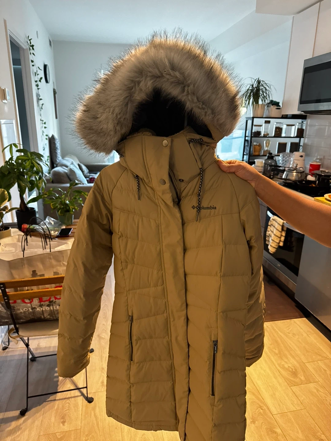 Selling a Columbia women's puffer jacket Size XS . It's in great condition and ready for the colder weather! The colour is a nice neutral tan that goes with everything. It also has a faux fur trim on the hood. Used less . Looks like new.