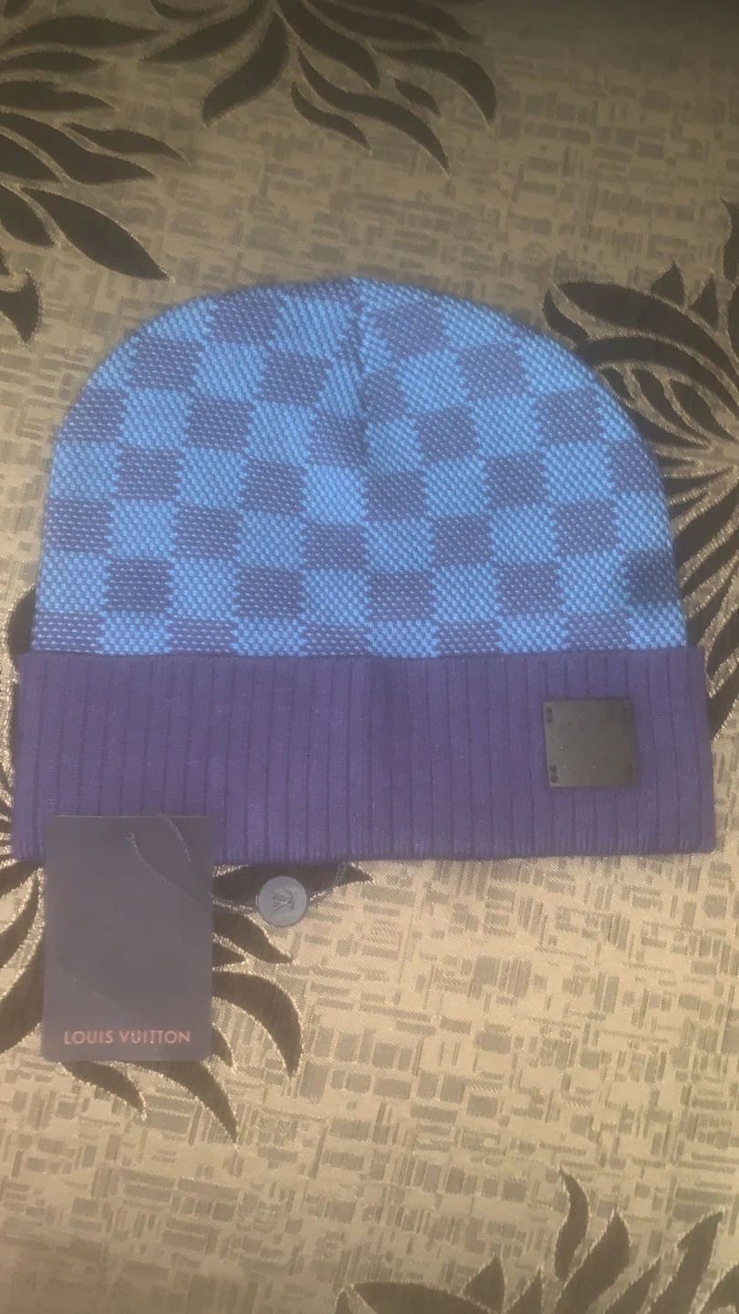 Selling a stylish Louis Vuitton beanie in a blue Damier pattern. It's in great condition and perfect for keeping warm during the colder months!