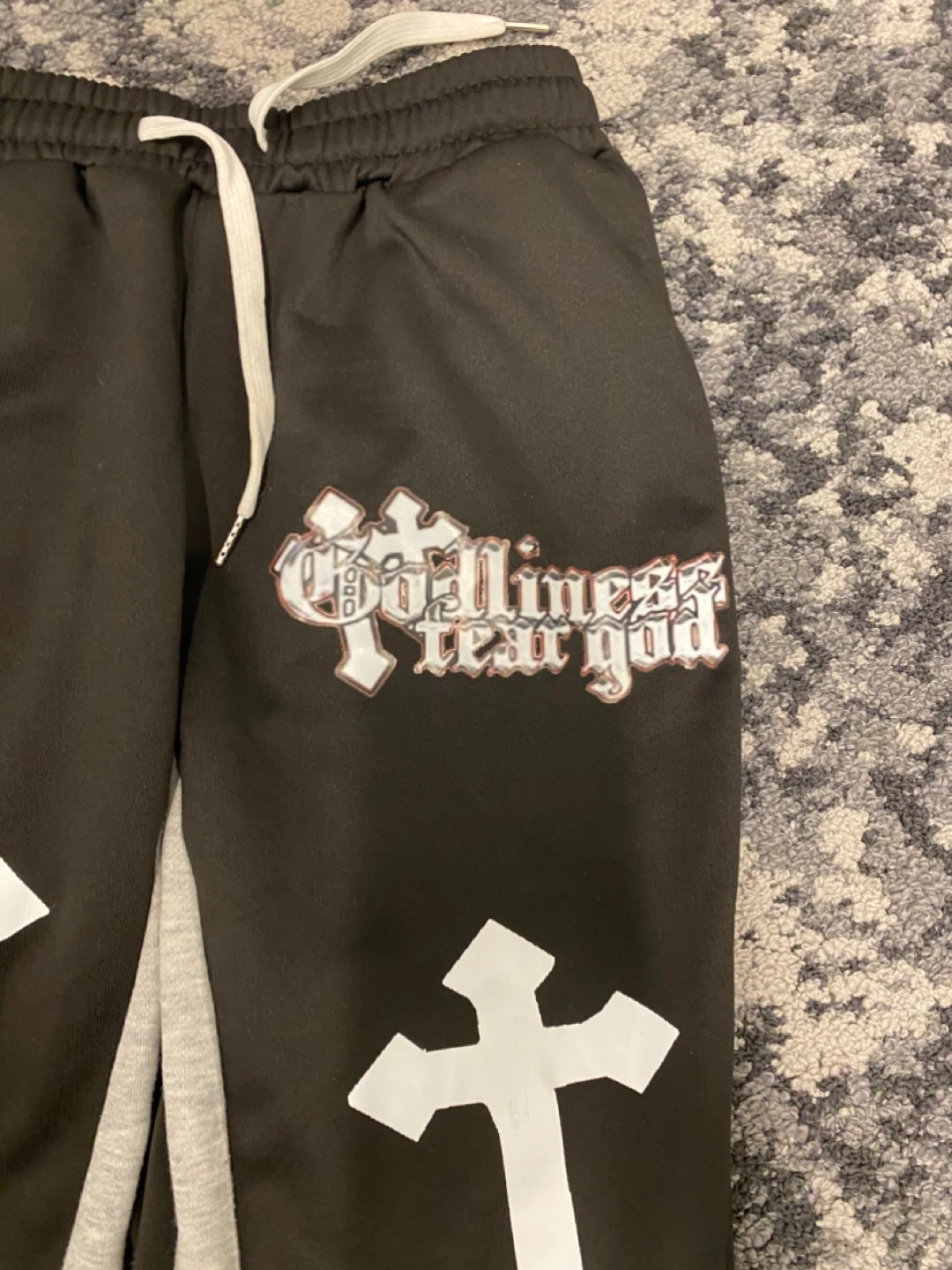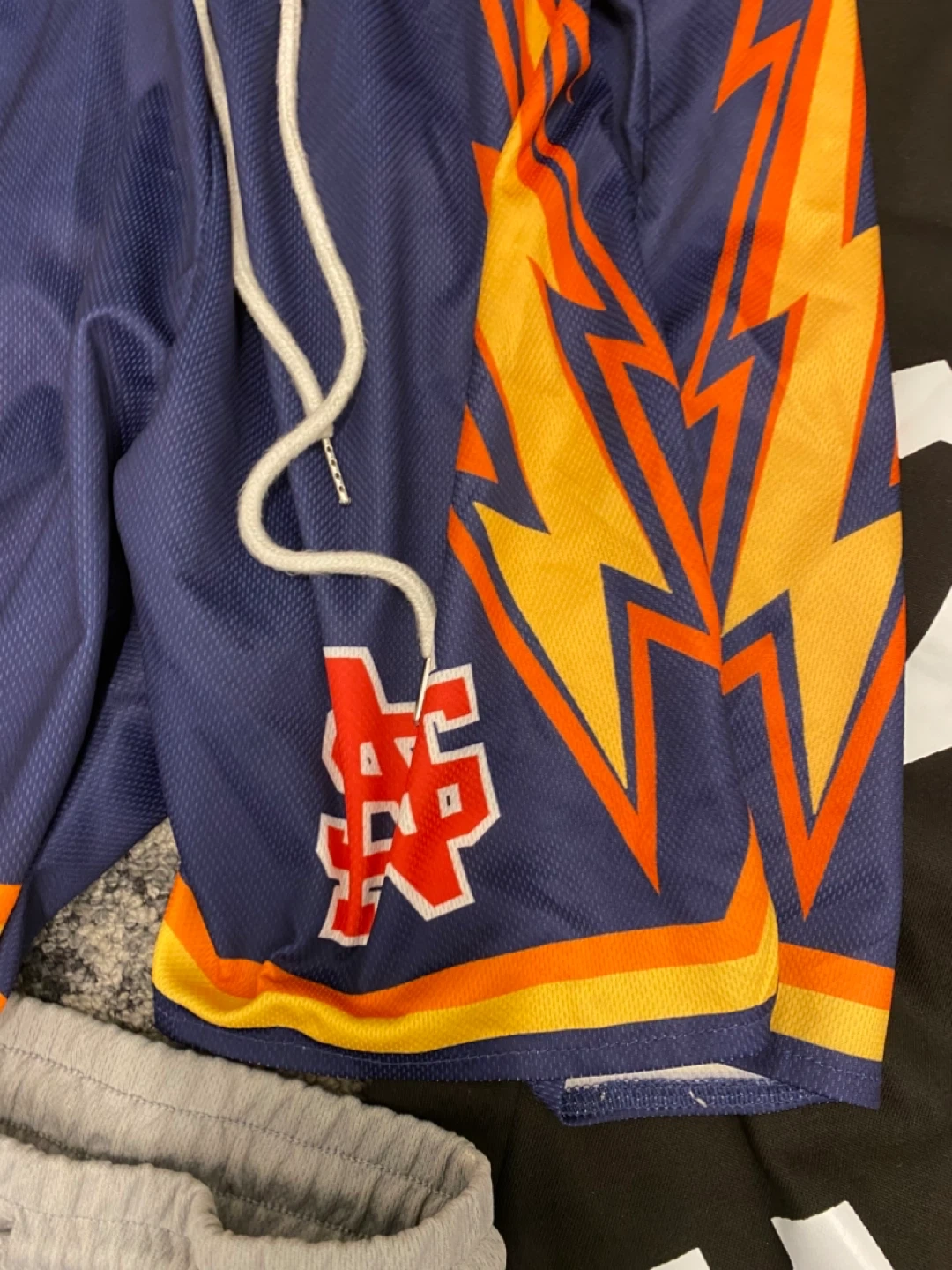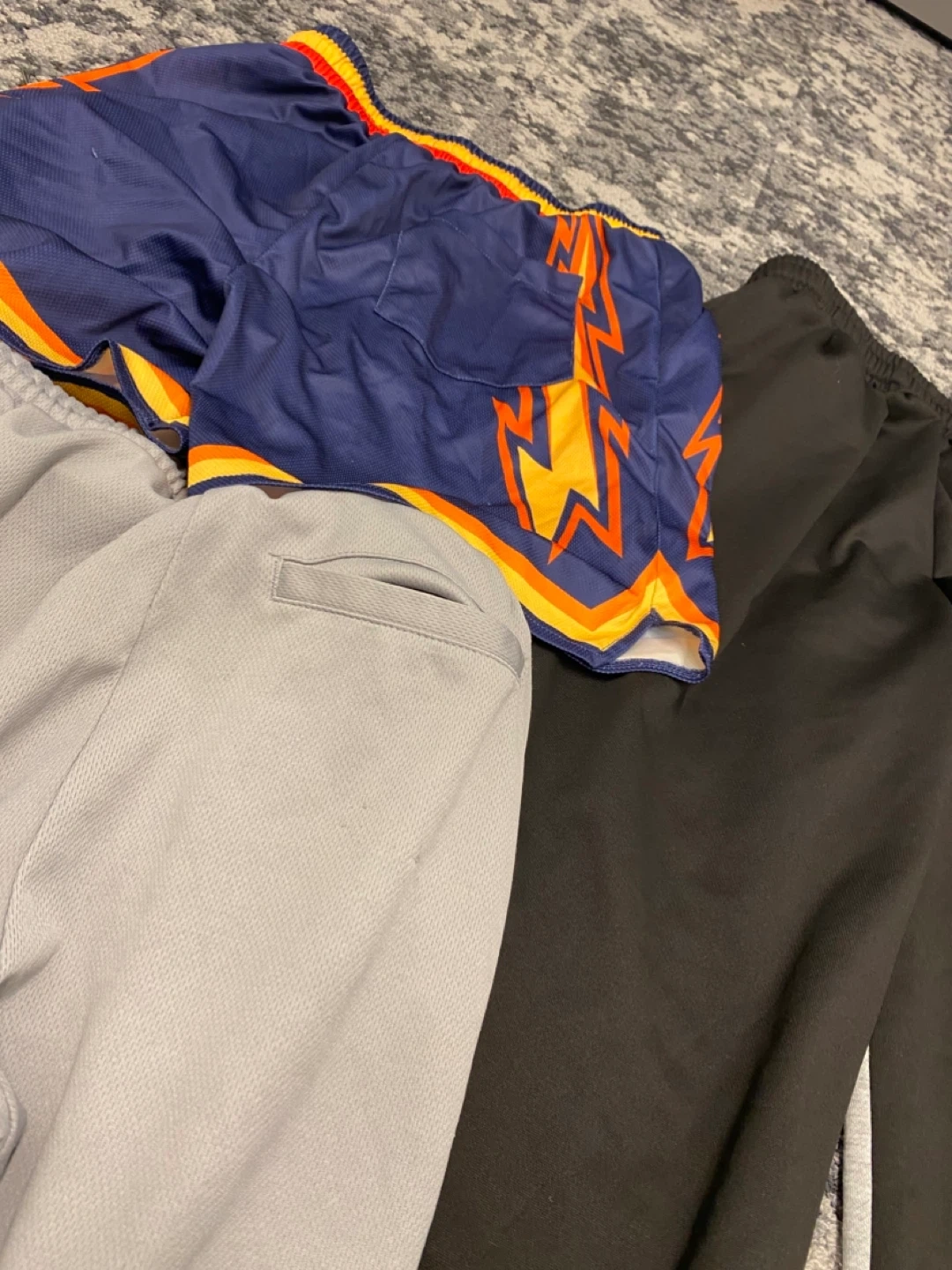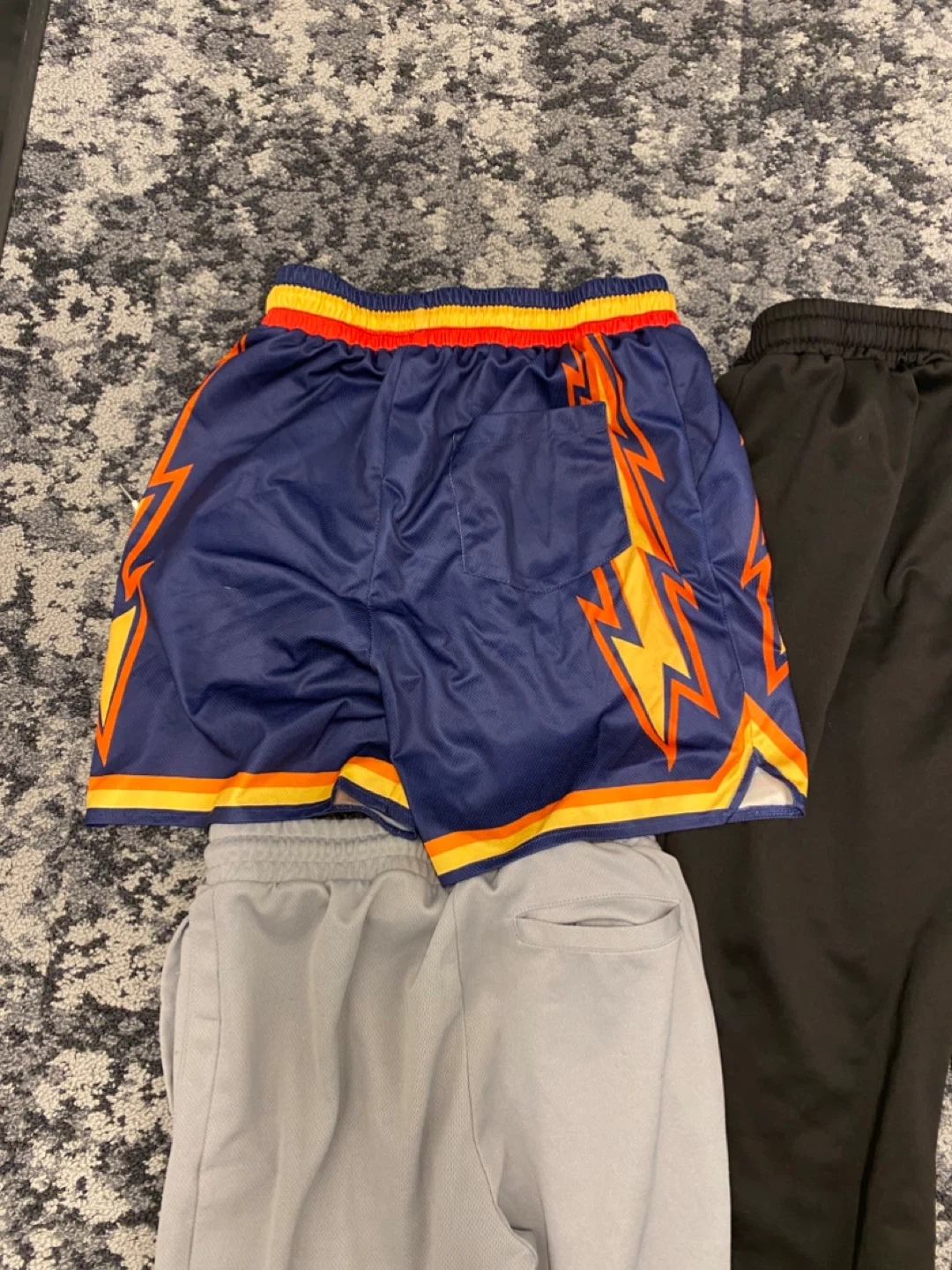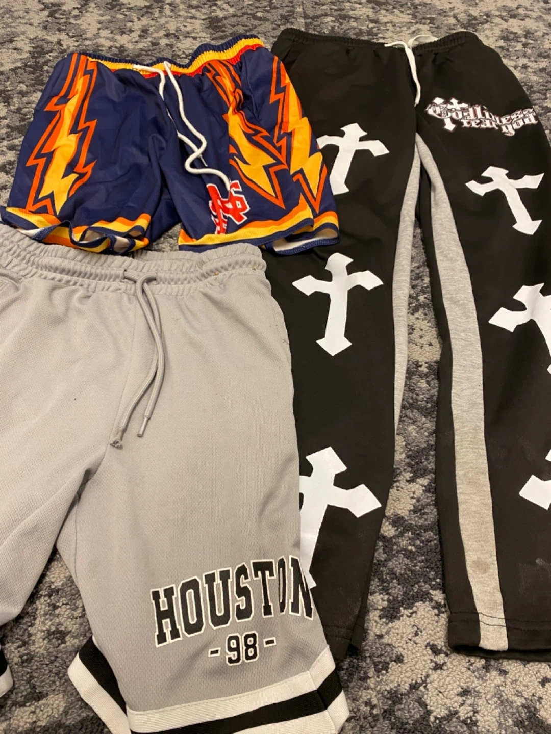 Selling a collection of men's shorts and pants. Includes a pair of black pants with cross designs, blue and orange lightning bolt shorts, and grey Houston shorts. All in good condition!