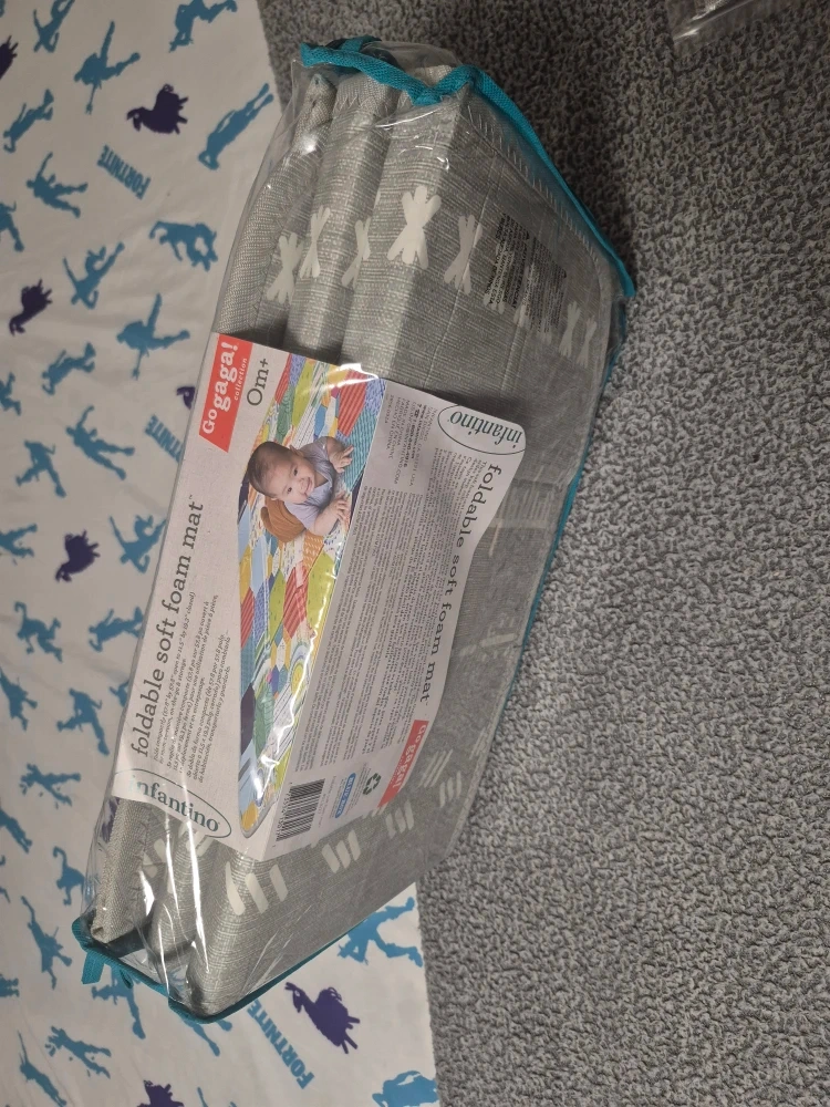 This Infantino foldable soft foam mat is brand new in its original packaging! It's perfect for babies aged 0 months and up. The mat measures approximately 4.82 ft x 4.82 ft (1.47 m x 1.47 m) when open, providing a large and safe play area for your little one
