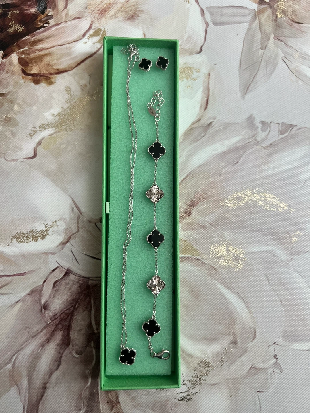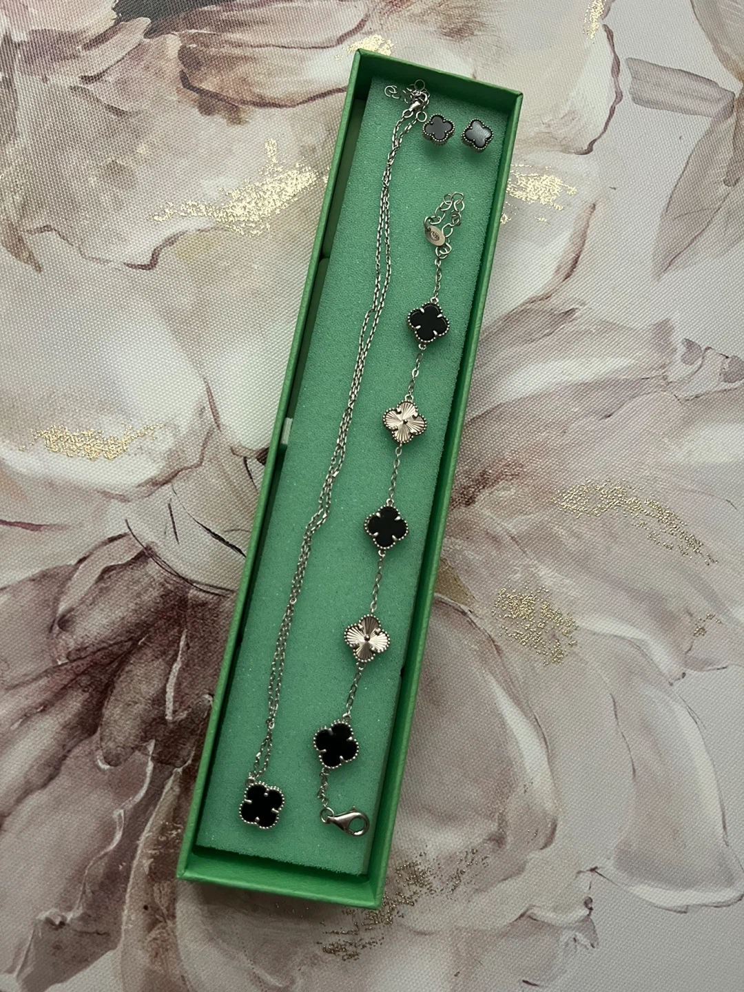 Selling a beautiful set of clover jewellery! This includes a necklace, bracelet, and stud earrings, all made of 925 sterling silver with black onyx detailing. The bracelet and necklace are adjustable. Originally bought for $222.61