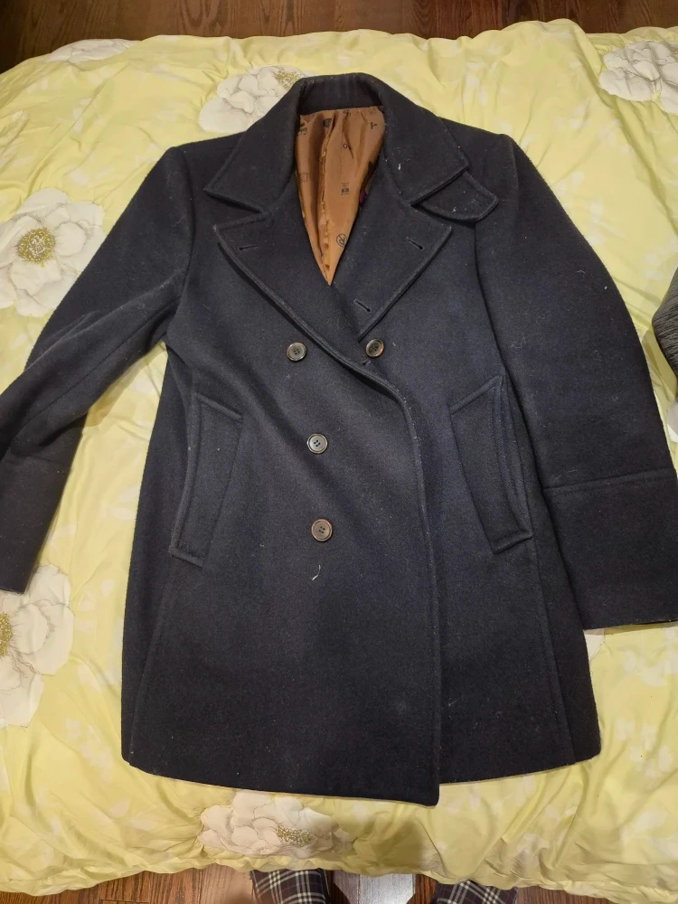 Here's a classic navy blue peacoat, perfect for the cooler weather! It's made of a wool blend and has a double-breasted design with brown buttons. The lining is a silky brown colour. It's in good condition and ready for a new home