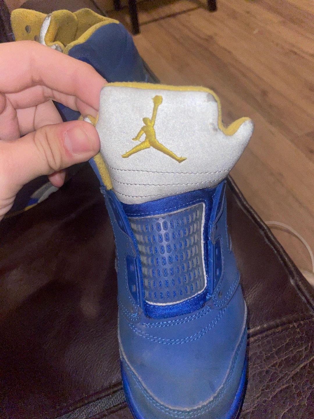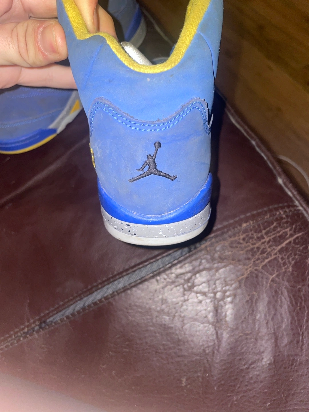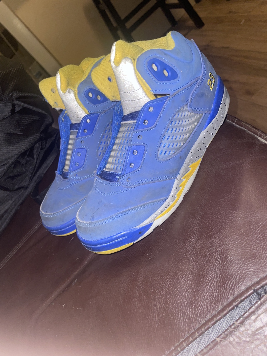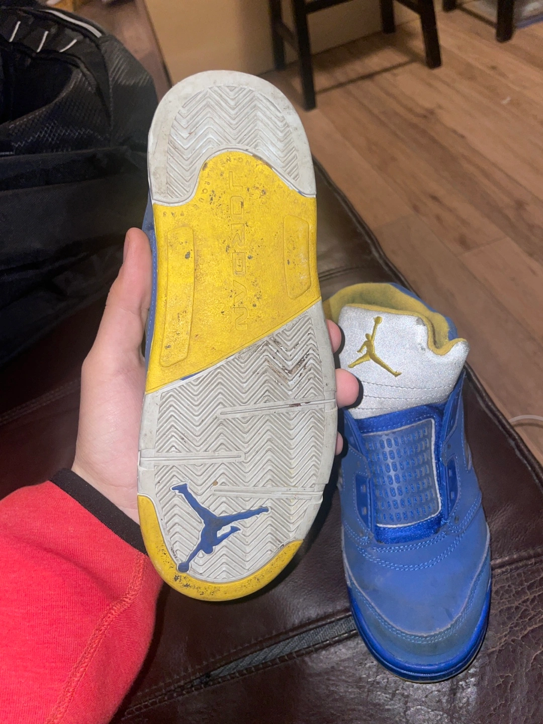 Selling a pair of Jordan 5 shoes in blue and yellow. They show some signs of wear, as you can see in the photos, but still have lots of life left! 2 youth has laces