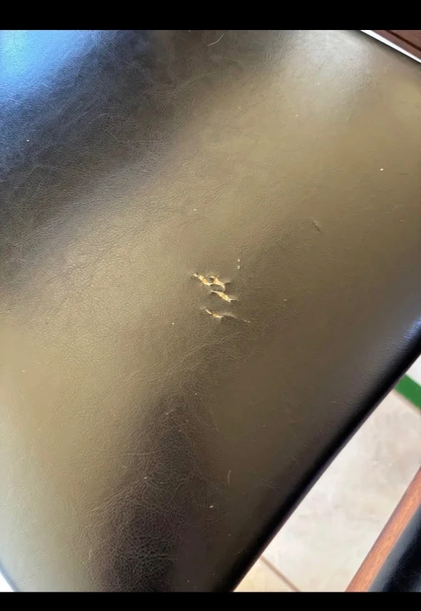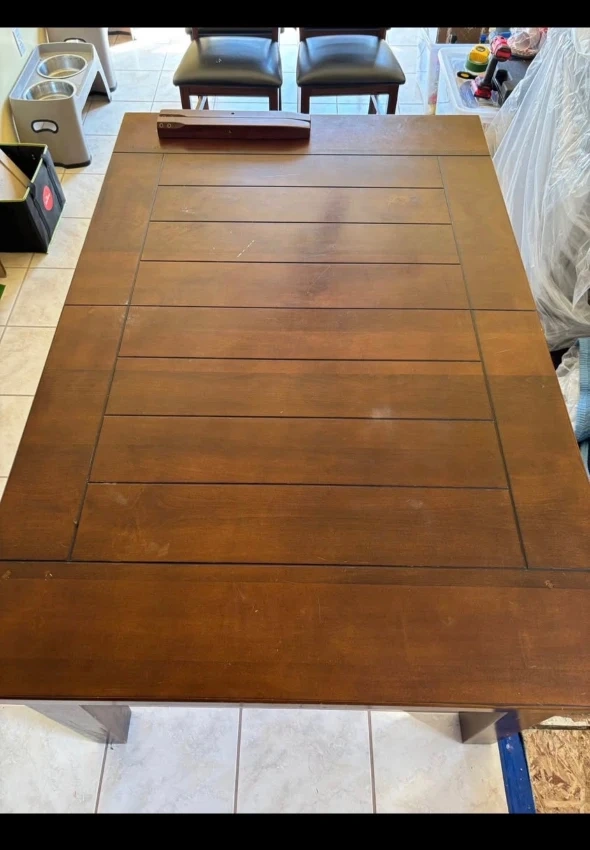 Selling a dining table set that includes four chairs and a bench. The chairs and bench have black leather seats and wooden frames. There are some signs of wear and tear on the chairs, including a tear on one of the chair seats and some scratches on the wooden frames. The table also has some scratches.