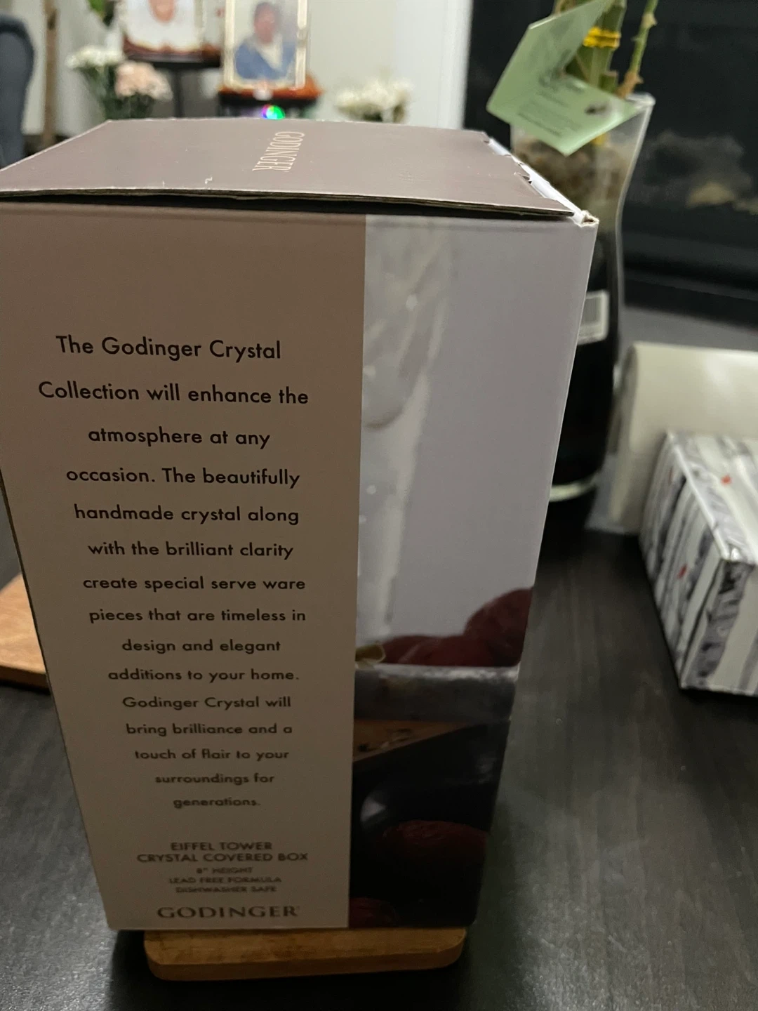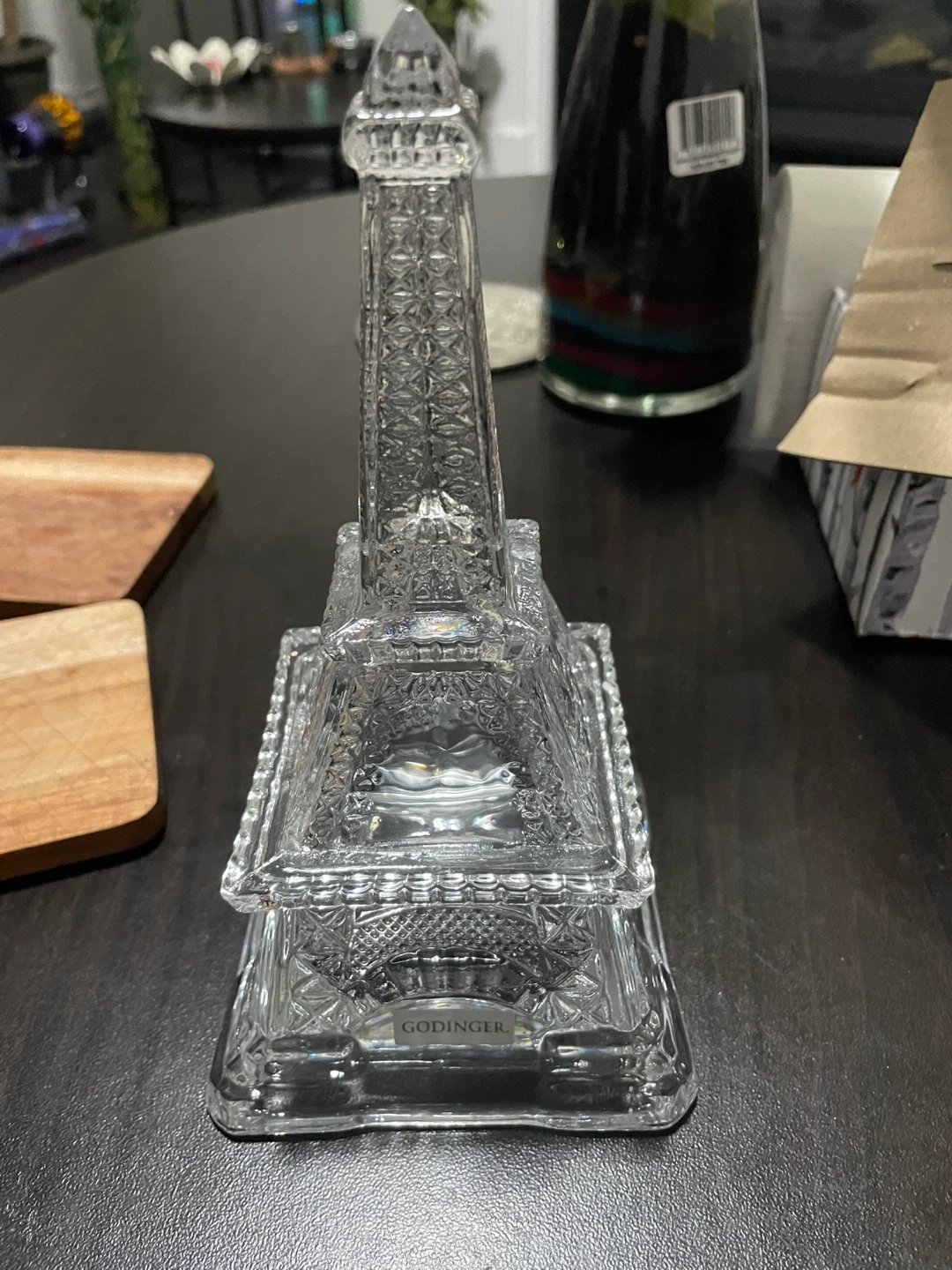 Selling a Godinger Eiffel Tower crystal covered box! This beautiful piece from the Godinger Crystal Collection will enhance the atmosphere at any occasion. It's a timeless design and elegant addition to your home. The box is dishwasher safe and comes with a wooden base