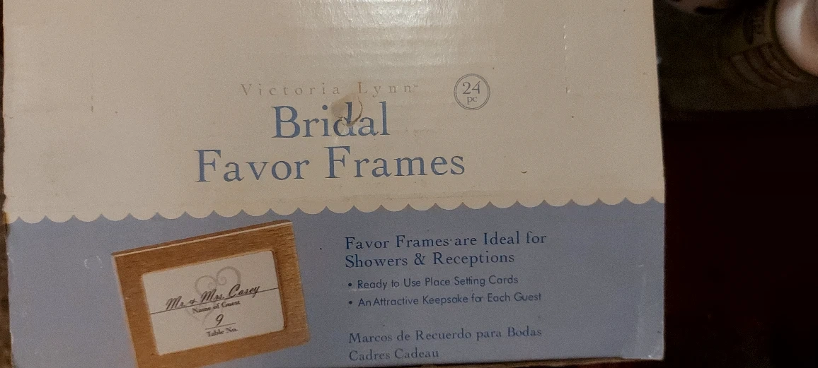 Selling a box of Victoria Lynn Bridal Favor Frames. There are 24 pieces in the box. They are ideal for showers and receptions and ready to use as place setting cards. They also make an attractive keepsake for each guest
