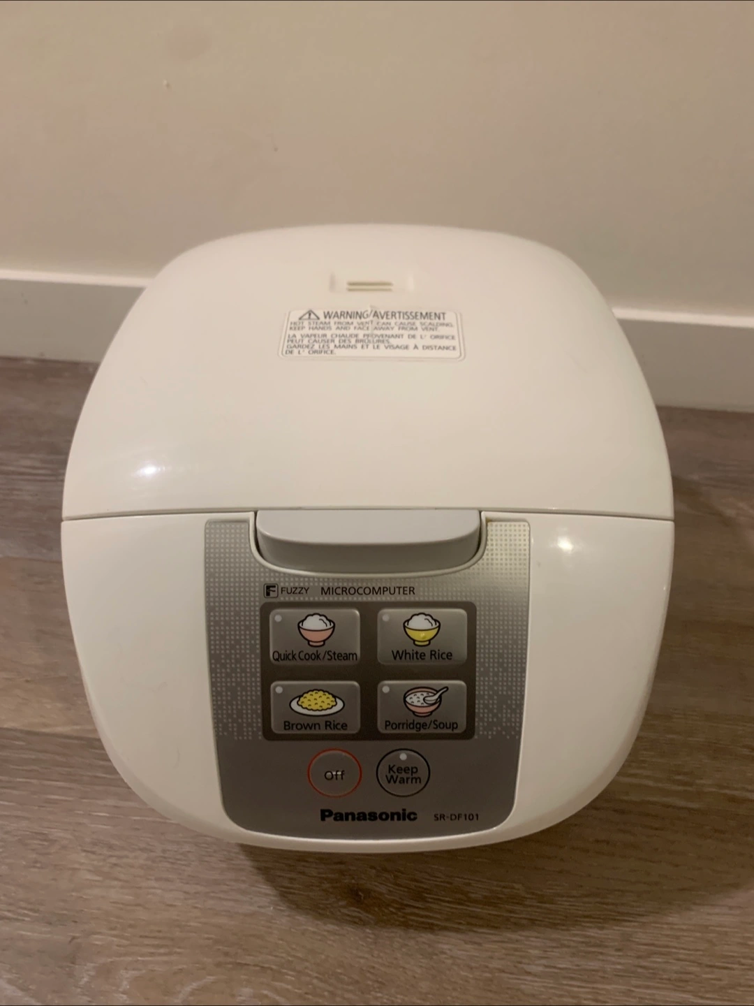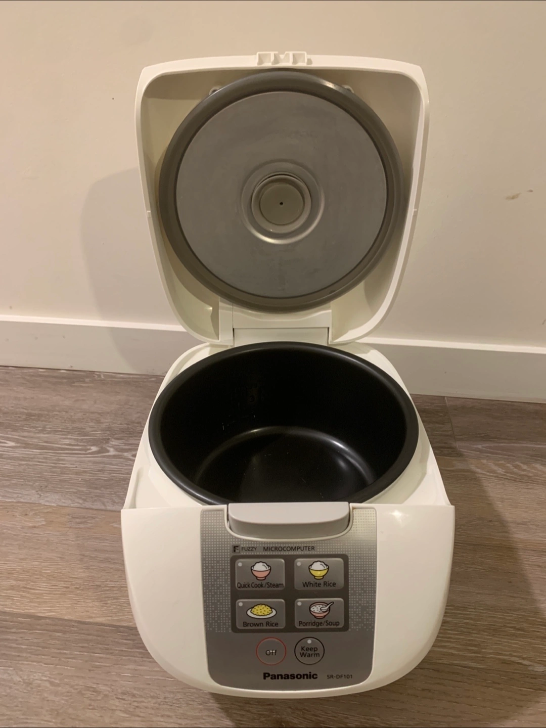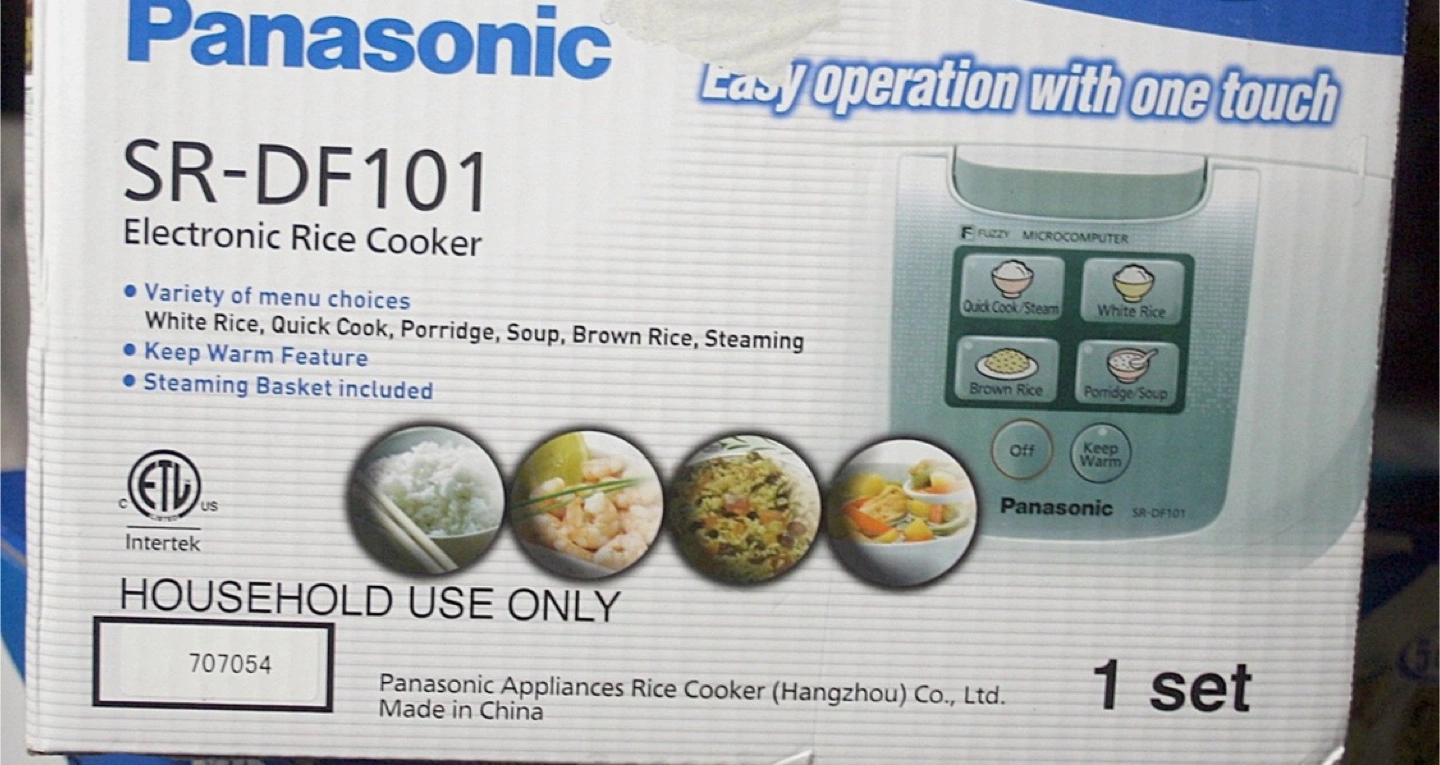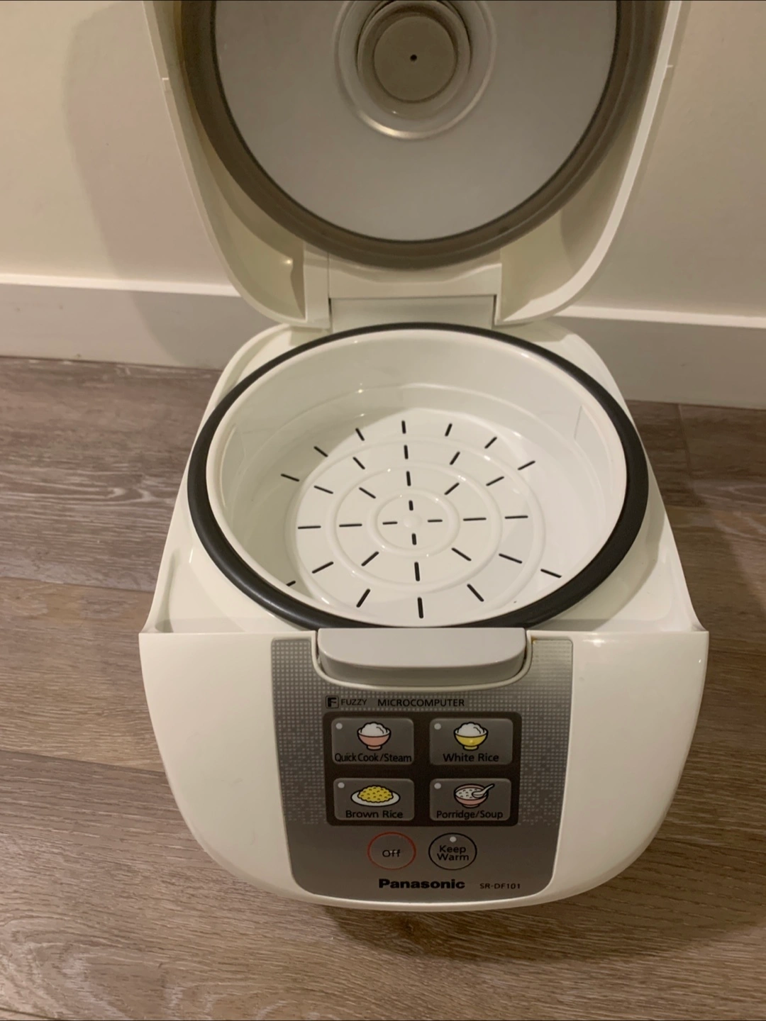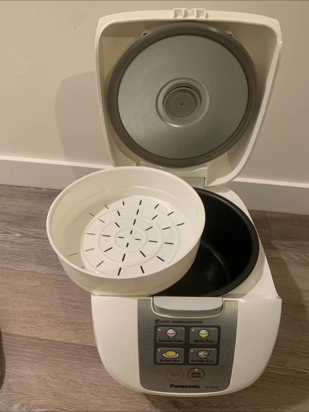 Selling a Panasonic SR-DF101 fuzzy microcomputer rice cooker. It has settings for quick cook/steam, white rice, brown rice, and porridge/soup. It also has a keep warm function.( New -steam tray ,rice paddle ,soup ladle,measuring cup )