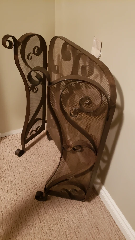 Selling a Daymeion metal fireplace screen with a lovely cocoa brown finish. It's hand-forged and in great shape! The dimensions are 127 cm wide, 85 cm high, and 4 cm deep. It weighs 15 kg
