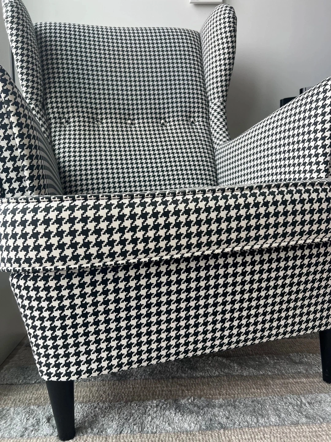 Selling a gently used Ikea Strandmon wing chair in a classic houndstooth pattern. It's super comfy and adds a stylish touch to any room! The chair is in great condition and ready for a new home.