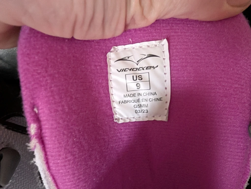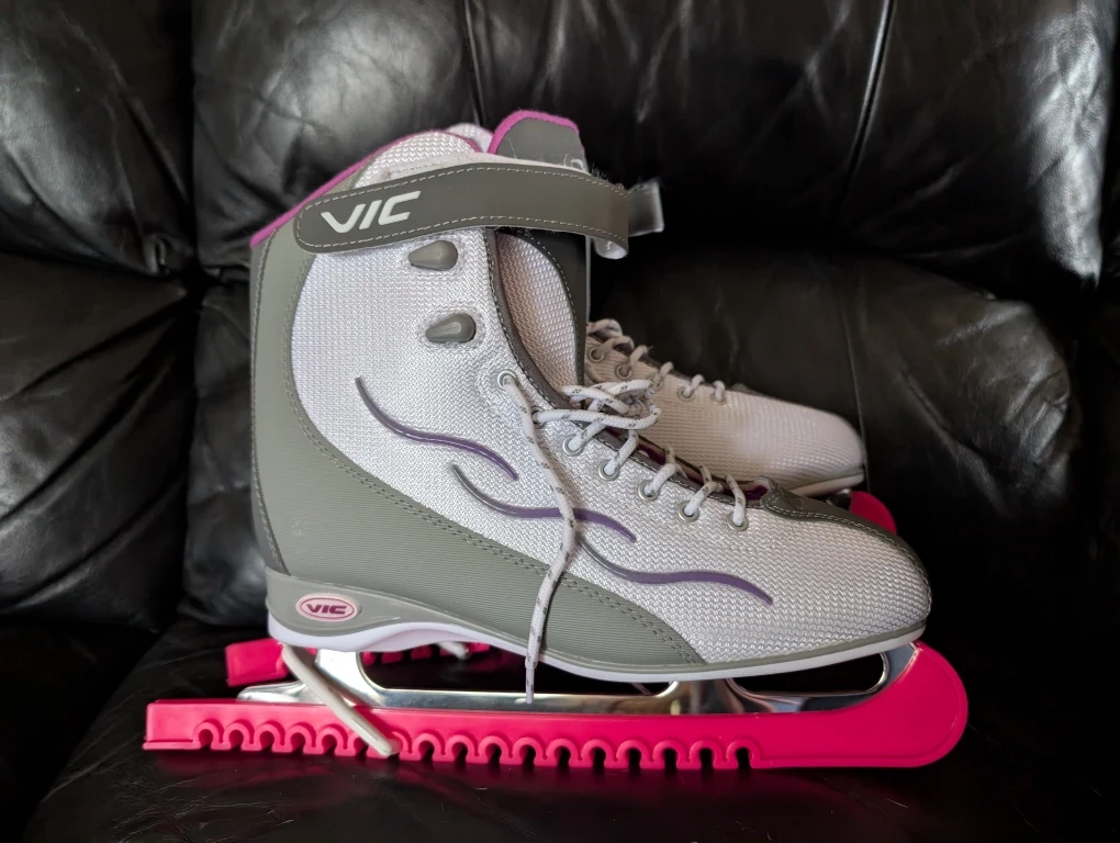 Selling a pair of Vic Hockey inline skates in great condition! They are a size US 9 and feature a stylish grey and white design with pink accents. Perfect for recreational skating or practicing your skills at the rink