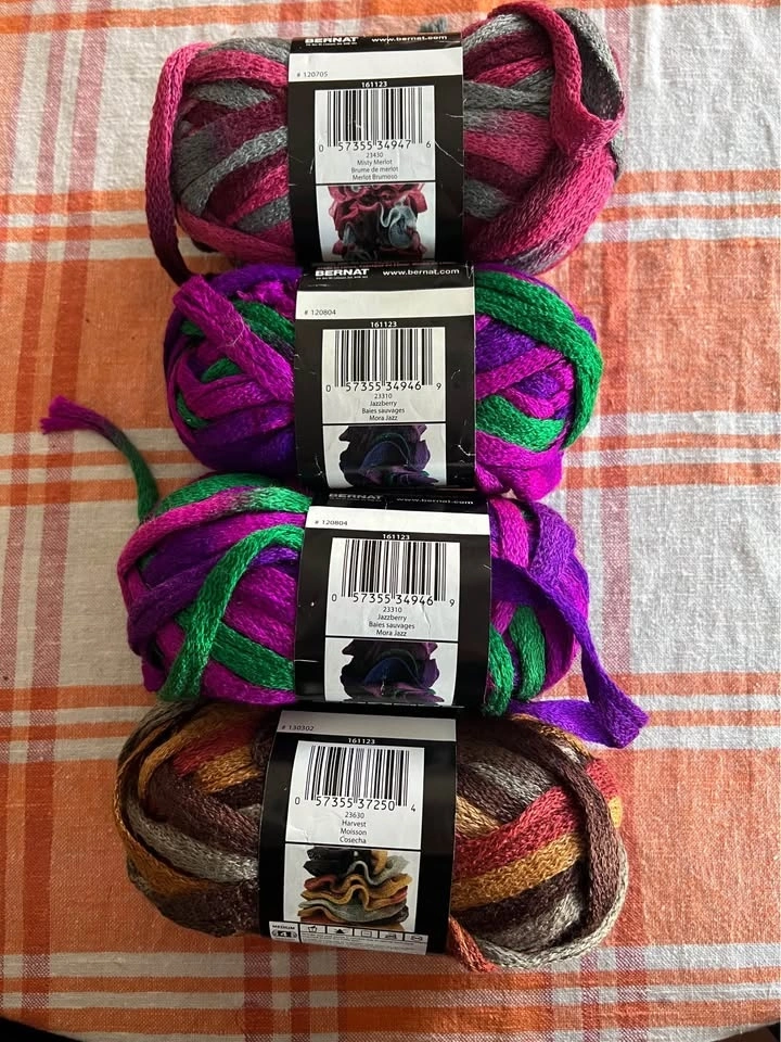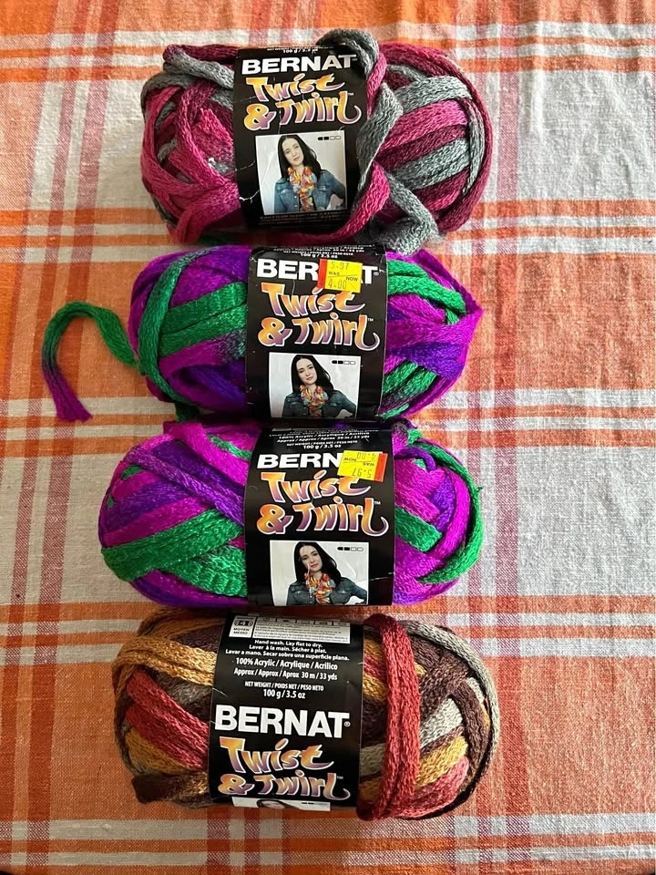 Four rolls of Twist&Twirl yarn by Bernat. This is a discontinued product. Four rolls available. Two rolls in Jazzberry, one in Merlot, one in Harvest. 100% Acrylic. Each roll 100g. Pickup in Courtice