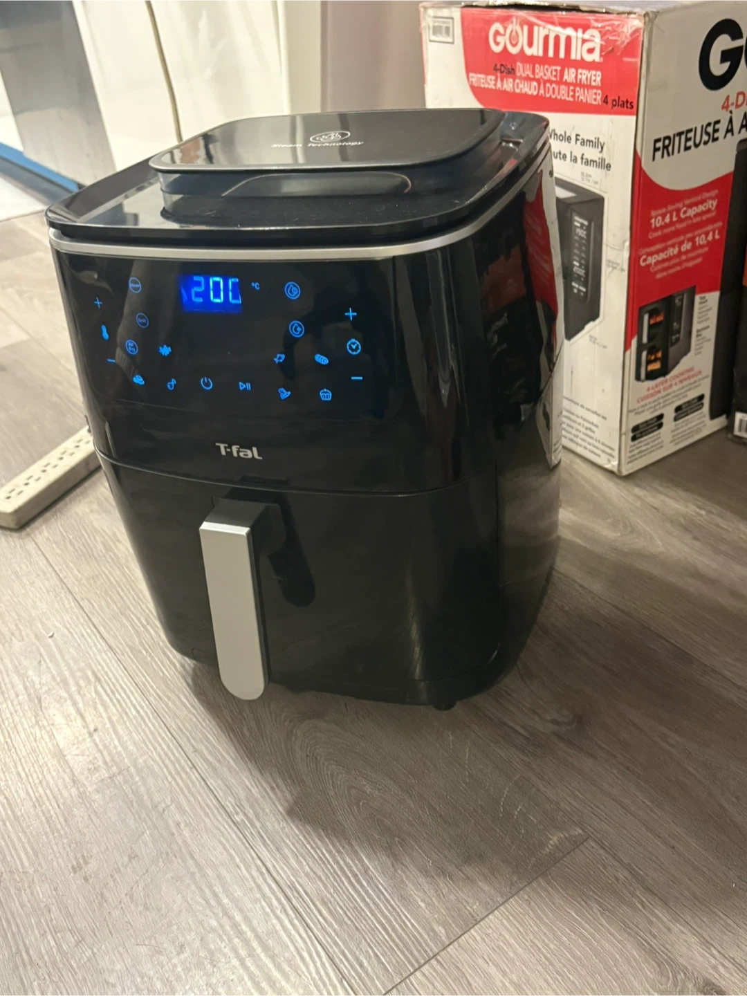 Selling a T-fal Easy Fry air fryer. It's black and in good condition. The box says it's a 4-Dish Dual Basket Air Fryer with a 10.4 L capacity. Great for making meals for the whole family!