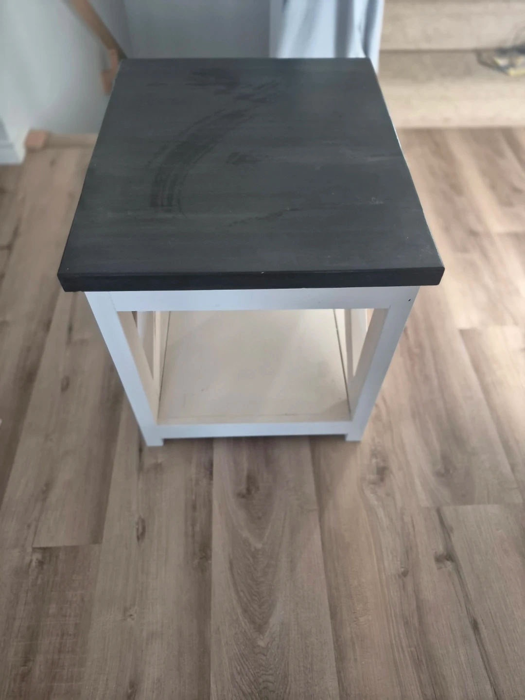 Selling a lovely, custom farmhouse-style end table! It features a black top and a white base with a decorative 'X' design on the sides. It's in great condition and would look fantastic in any living room or bedroom.