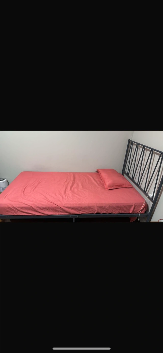 Selling a black metal bed frame. It's in good condition and ready for a new home! Perfect for a minimalist or modern bedroom style. Along with the mattress.