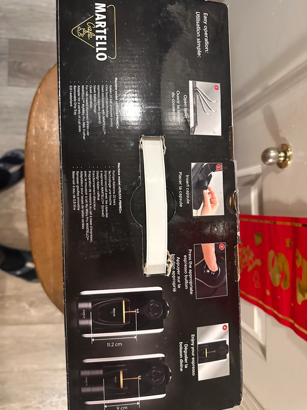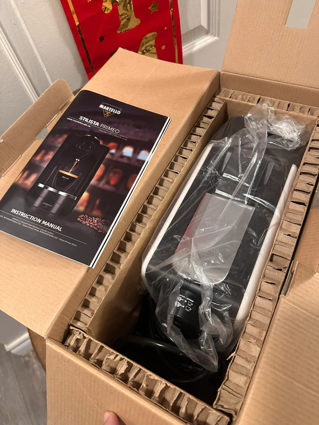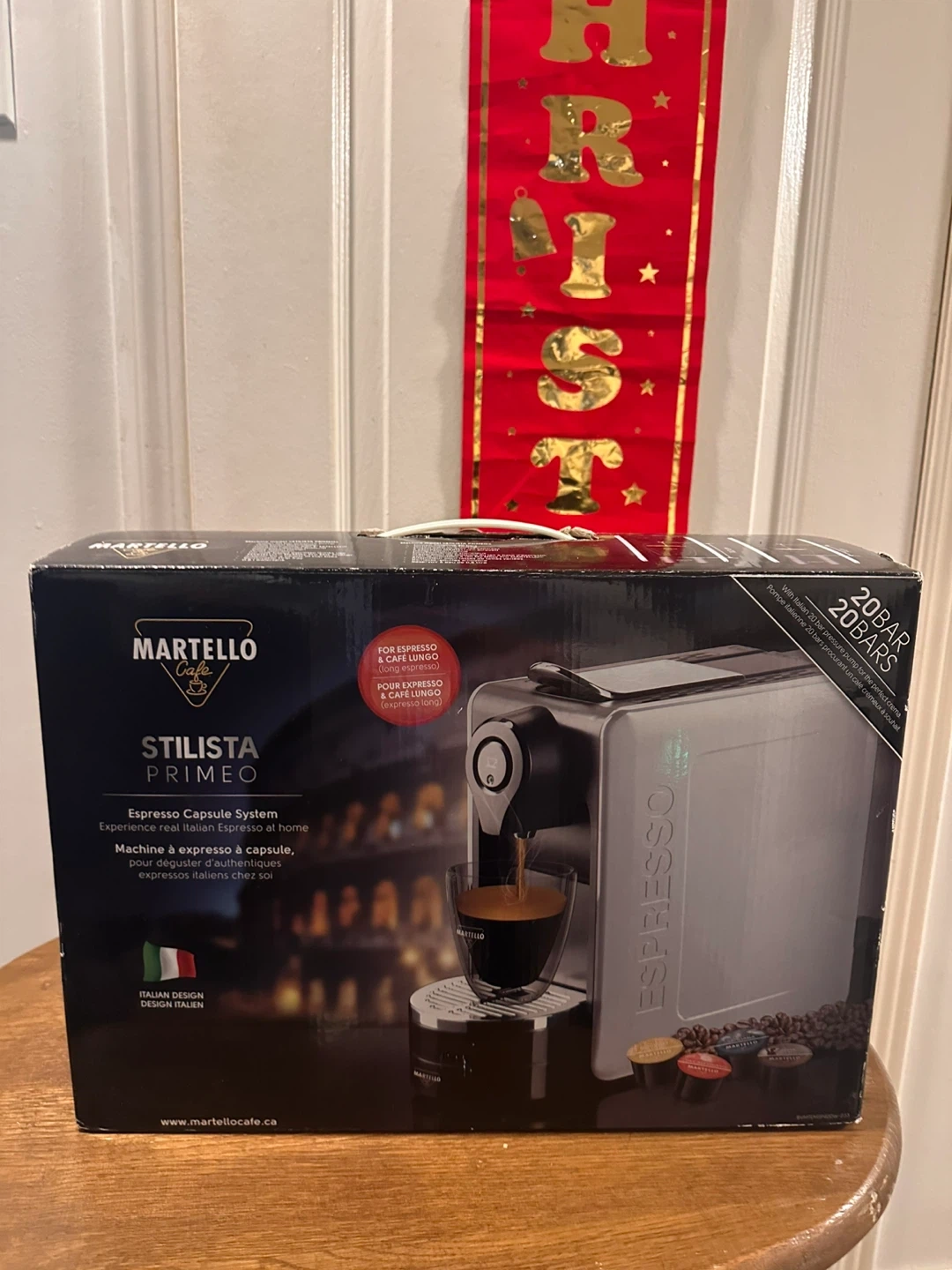Selling a Martello Cafe Stilista Primeo espresso machine! It's an espresso capsule system made in Italy. The box includes instructions on how to use it for delicious espresso-based drinks. It's compatible with My Milky Pro for creating lattes and cappuccinos. Easy to operate with a simple lever and capsule insertion
