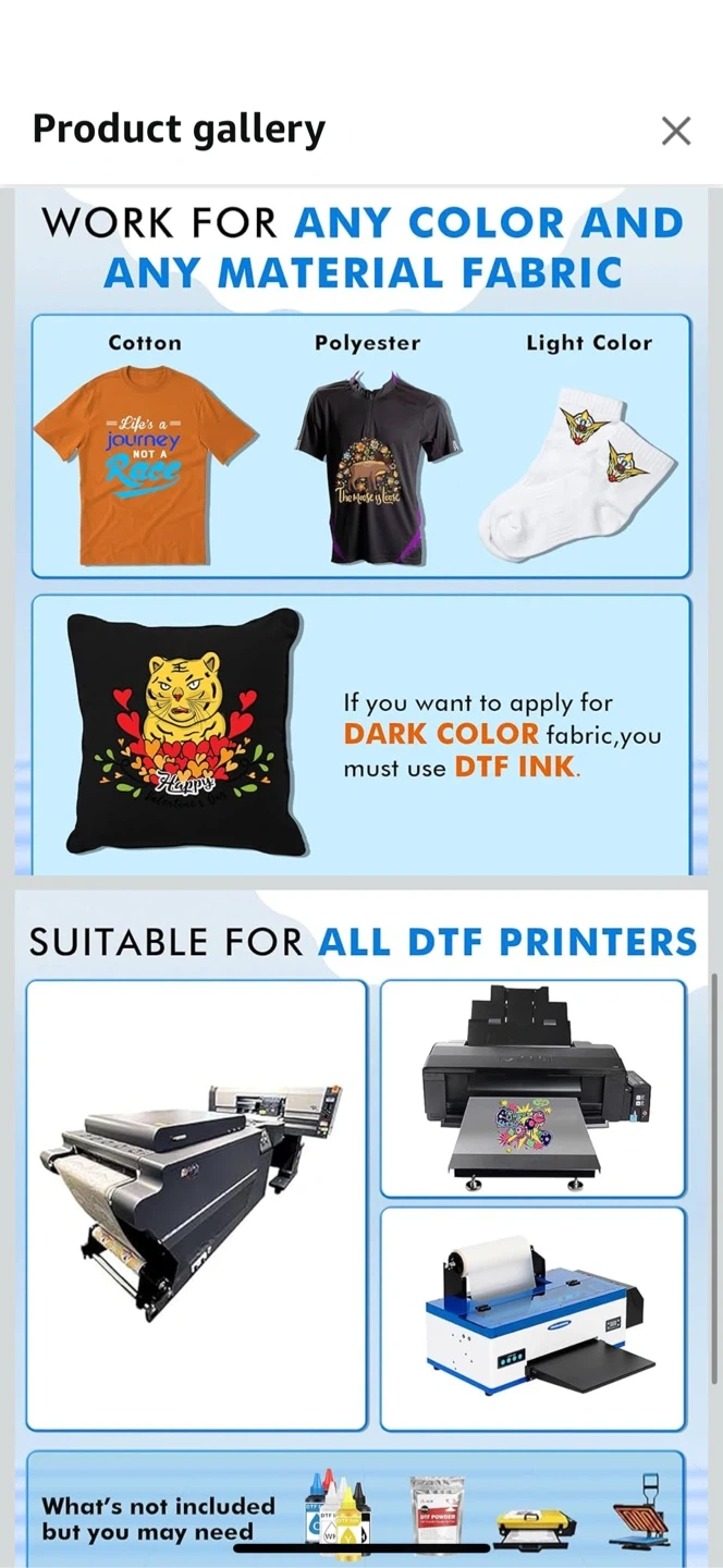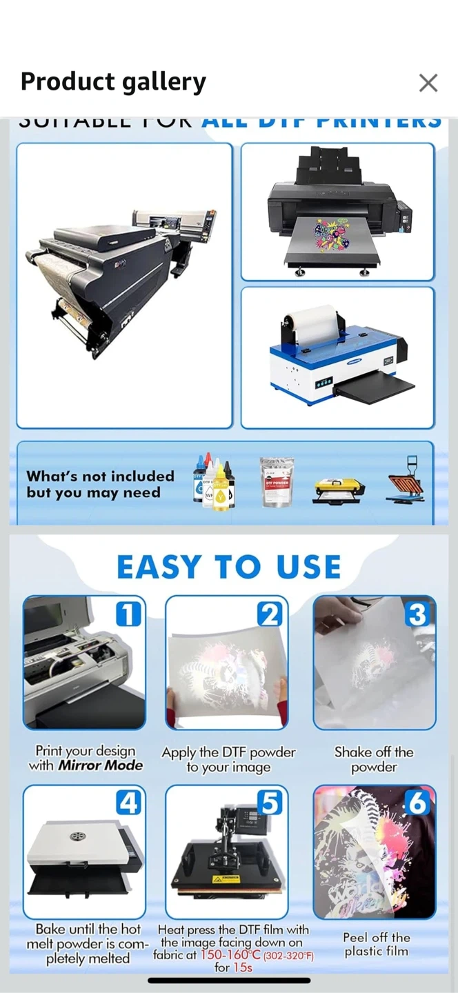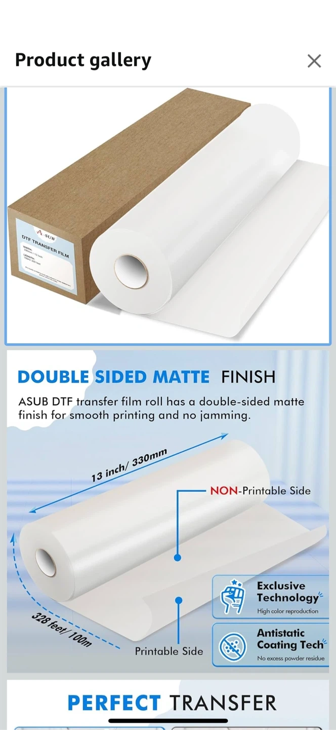 Selling an ASUB DTF transfer film roll. It has a double-sided matte finish for smooth printing and no jamming. It's 13 inches / 330mm wide and 328 feet / 100m long. Suitable for all DTF printers and works for any color and any material fabric