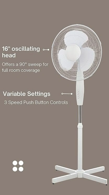 Oscillating and tilt adjustable head with 90° sweep for optimal directional air flow and full room coverage. Equipped with an adjustable stand to set your perfect height