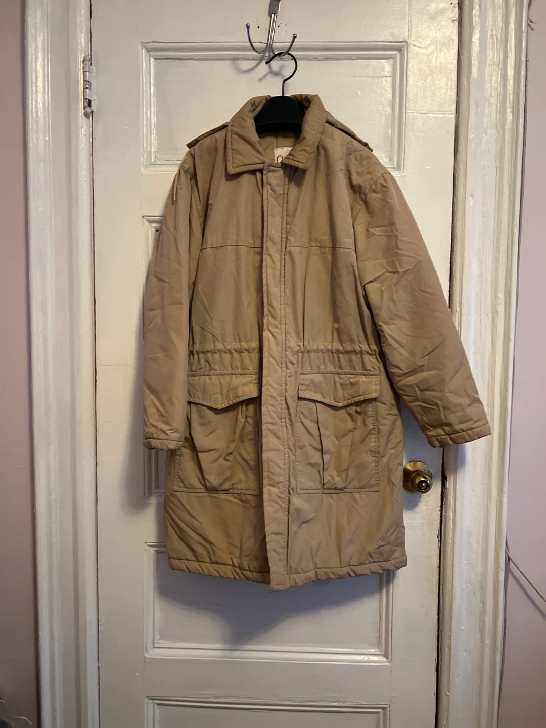 I'm selling a Clipper Mist coat in size M. It's a beige color and made in Sri Lanka. The shell is 65% polyester and 35% cotton, with a 100% nylon lining. It can be washed by hand or machine in lukewarm water, and dry cleaned if needed