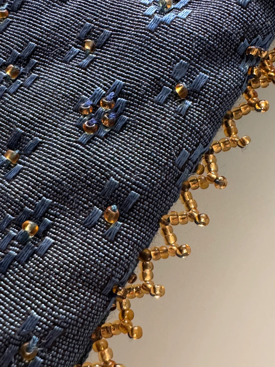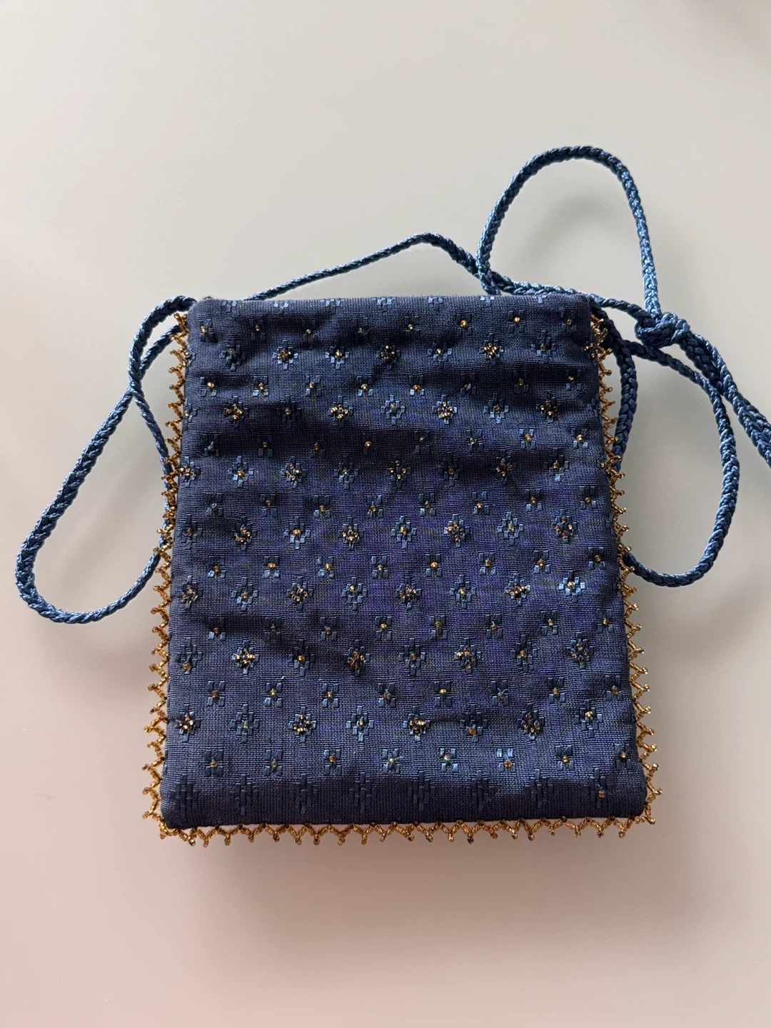 Check out this unique handmade purse! It's a beautiful blue colour with intricate beaded detailing. The tag indicates it was made in Egypt. It's perfect for adding a touch of worldly charm to any outfit!