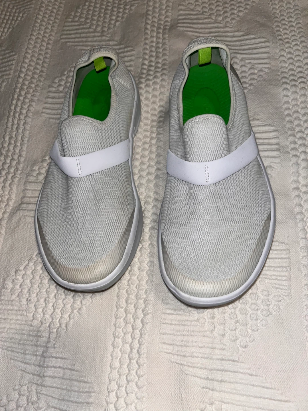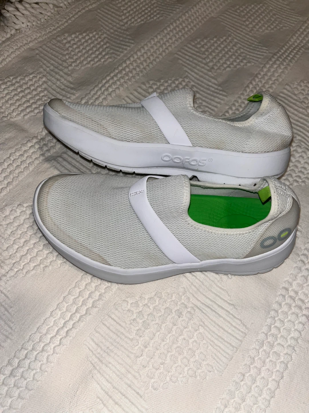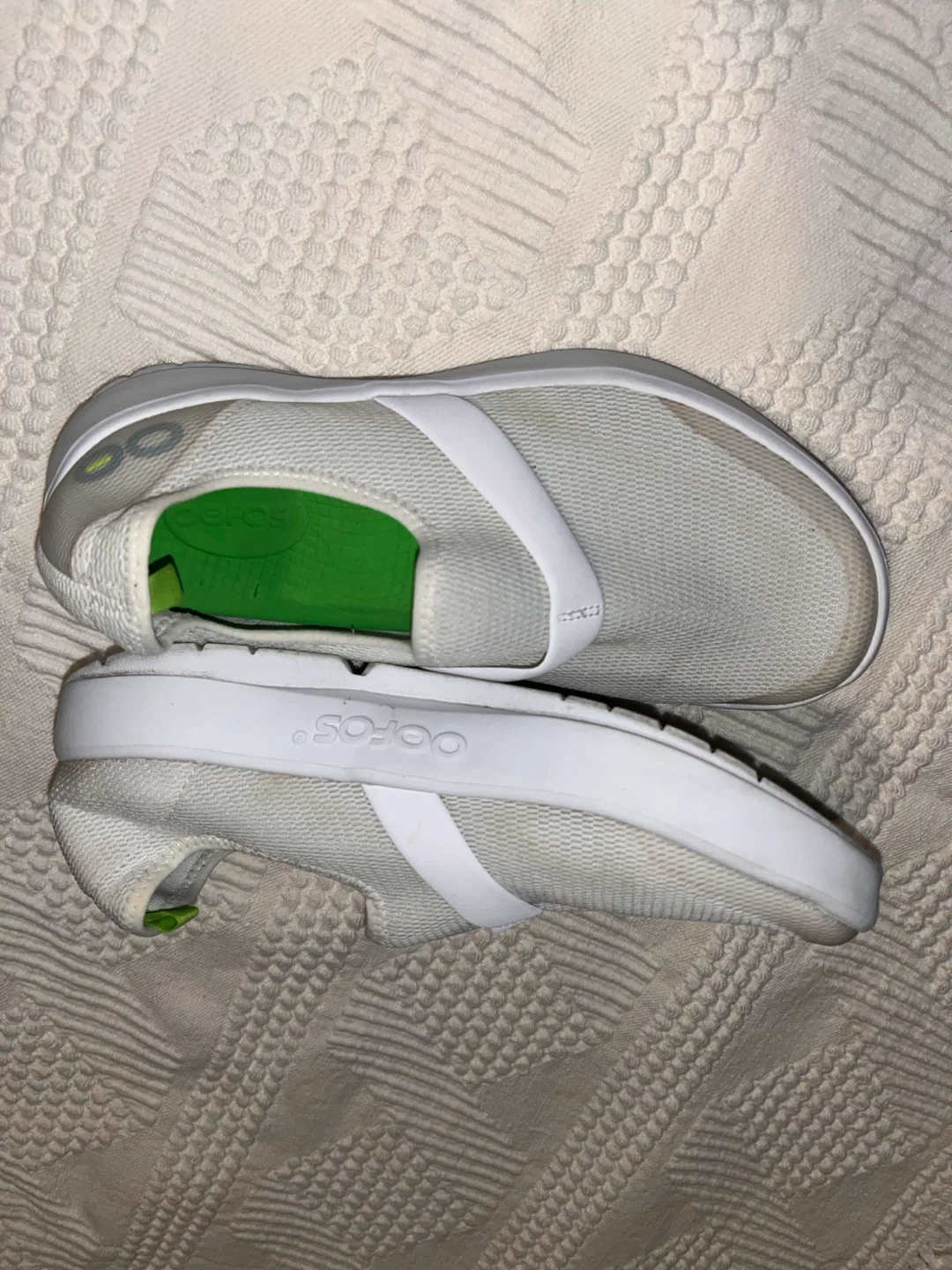 Selling a pair of OOFOS OOmg Low Mesh shoes in white. They are super comfy and great for everyday wear! The shoes have a unique design and are perfect for anyone looking for comfort and style.