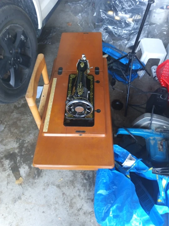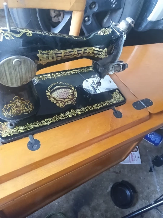 Selling a vintage sewing machine by Fair Titan Manufacturing Co. It features a black and gold design with a wooden table. A unique piece for any sewing enthusiast!
