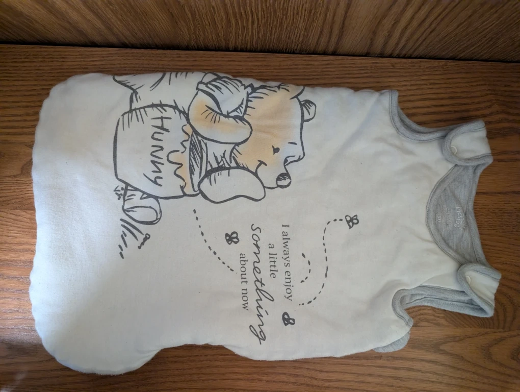 Here's a super cute Winnie the Pooh sleep sack! It's a size small and features a sweet Pooh design. Perfect for keeping your little one cozy and snug during naptime or bedtime