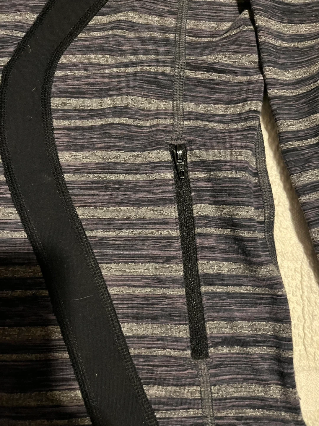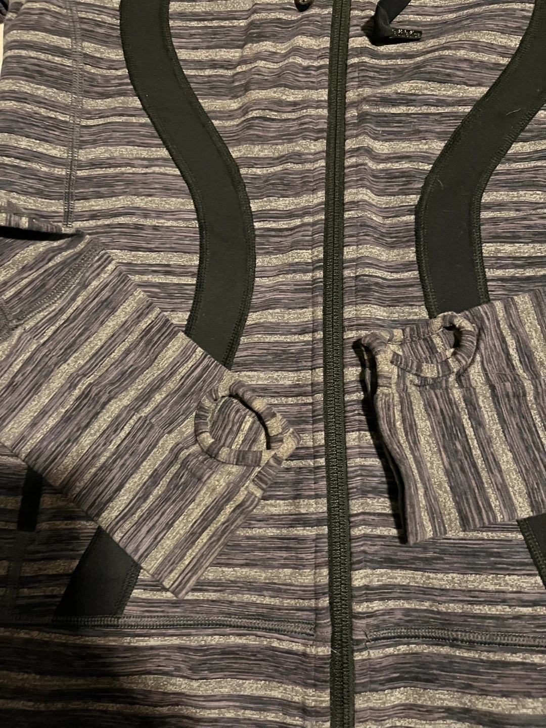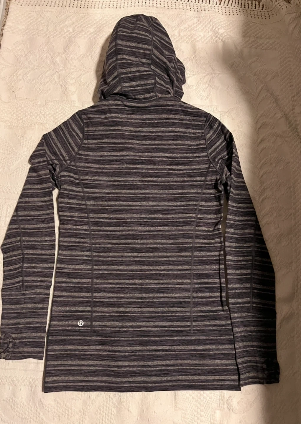 Lululemon Athletica jacket in size 6. It features a striped pattern in shades of grey and black, and the material is a blend of nylon and lycra. Perfect for layering or wearing on its own! Excellent condition.