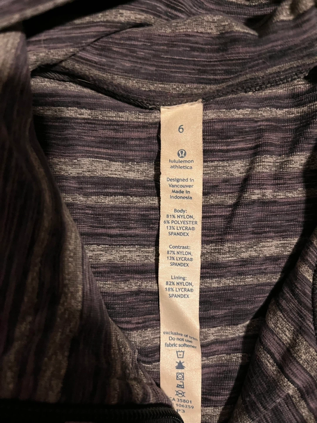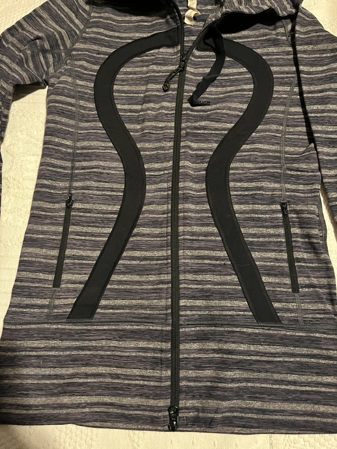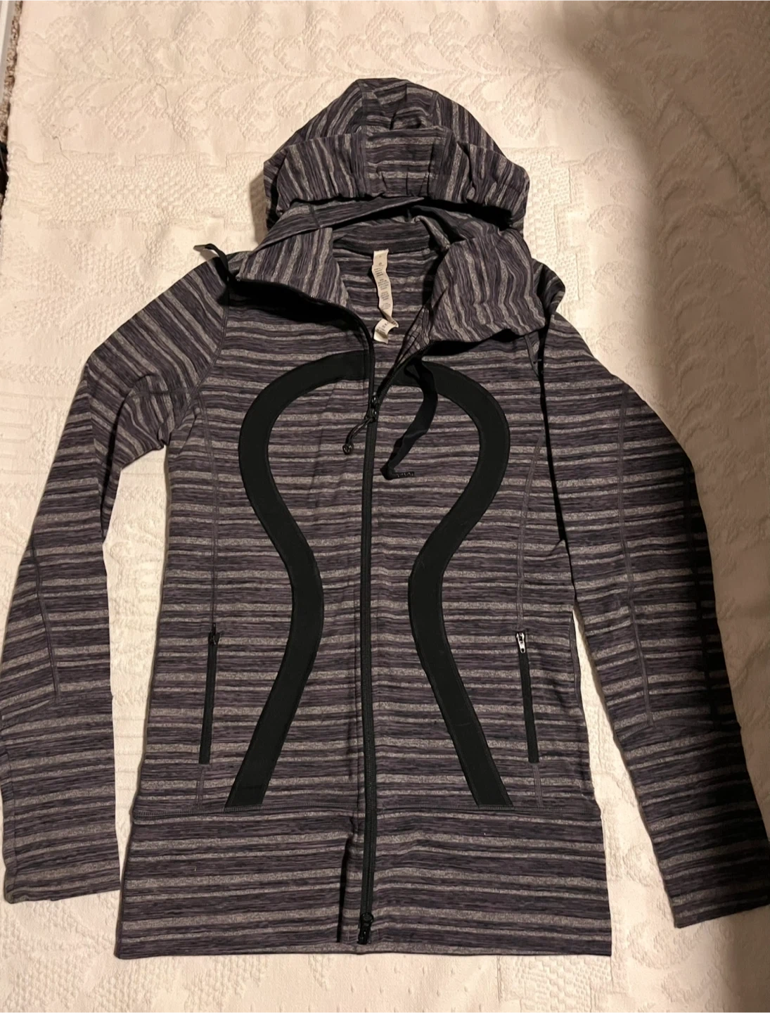 Lululemon Athletica jacket in size 6. It features a striped pattern in shades of grey and black, and the material is a blend of nylon and lycra. Perfect for layering or wearing on its own! Excellent condition.