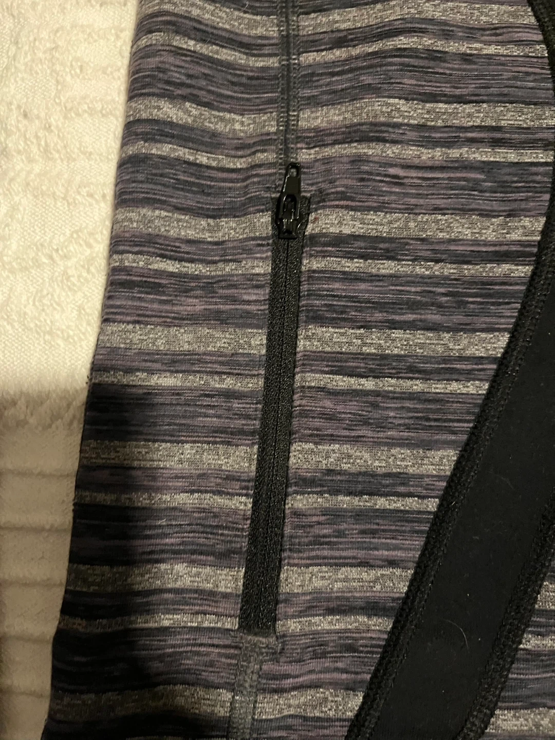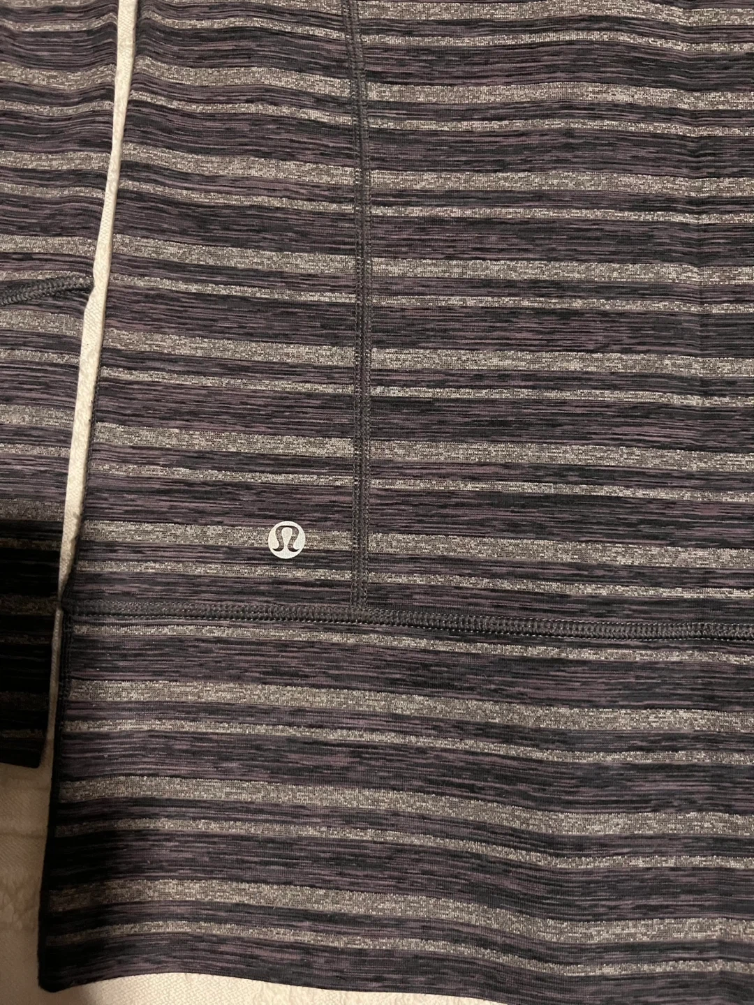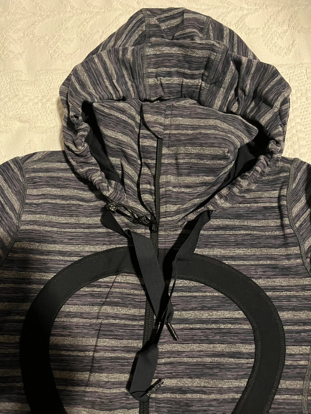 Lululemon Athletica jacket in size 6. It features a striped pattern in shades of grey and black, and the material is a blend of nylon and lycra. Perfect for layering or wearing on its own! Excellent condition.