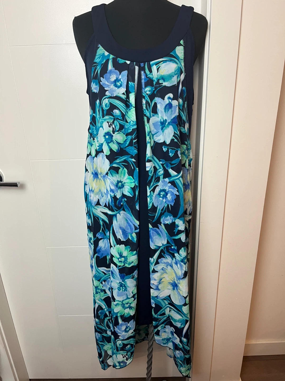 Selling a lovely Bianca Nygård dress in size L! It features a beautiful floral pattern in shades of blue and green. Made in Canada!