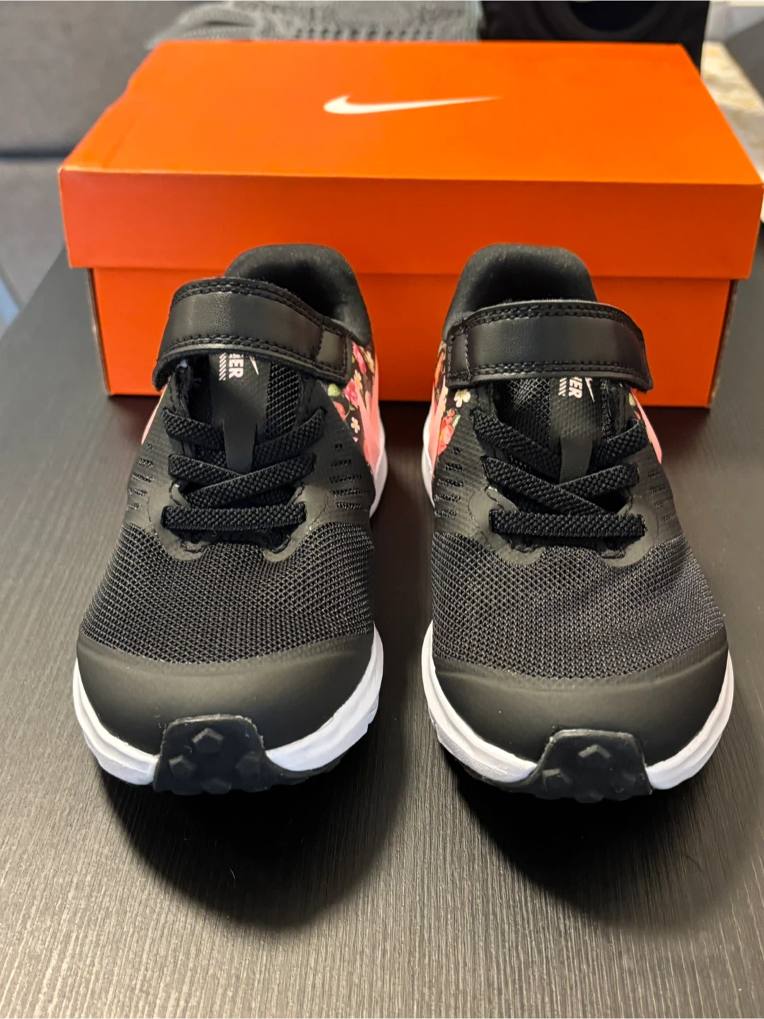 A reliable lightweight shoe with a refreshed look created with flower graphics and a 3D Nike logo. On top, the cushioned collar is turned out in back to relieve pressure on the foot, and an adjustable strap makes it easier for little kids to put the shoe on and take it off. At the forefoot, lightweight mesh offers breathability, and a soft Phylon foam midsole provides cushioning.