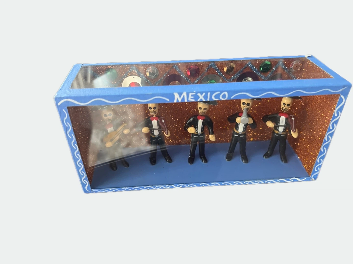 Selling a unique display featuring a skeleton band from Mexico. It's a hand painted decorative piece in glass not plastic case, measuring 8 in long by 3.5 tall by 2.5 wide.
